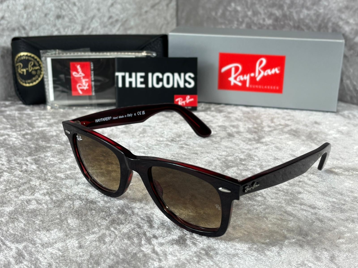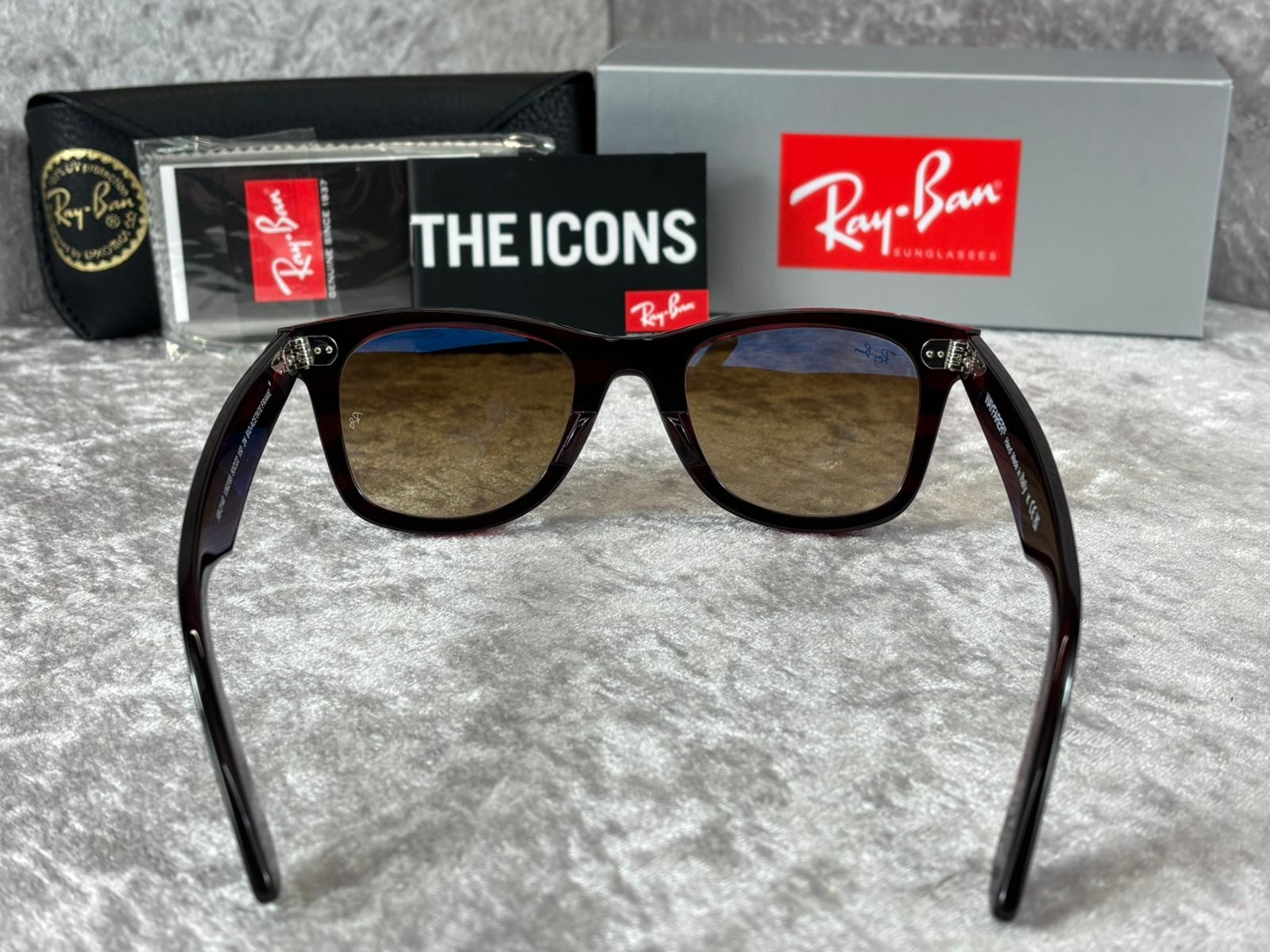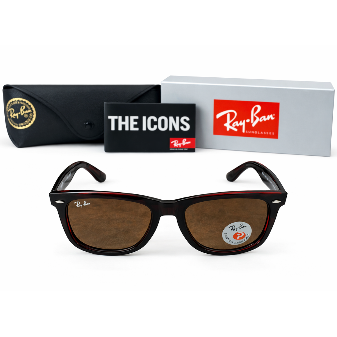 A brand new, unused and boxed pair of Ray-Ban RB2140 136285 sunglasses, showcasing a bold striped red and brown frame that delivers a striking and contemporary twist on a timeless silhouette. This distinctive colourway adds depth and personality while maintaining the instantly recognisable appeal of the classic Wayfarer design, making it a standout accessory for any collection.