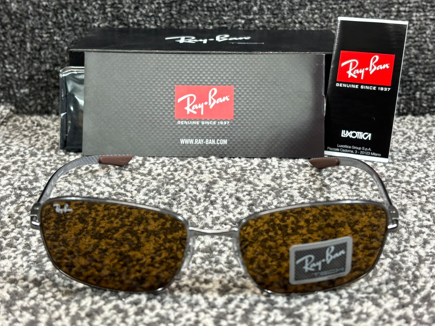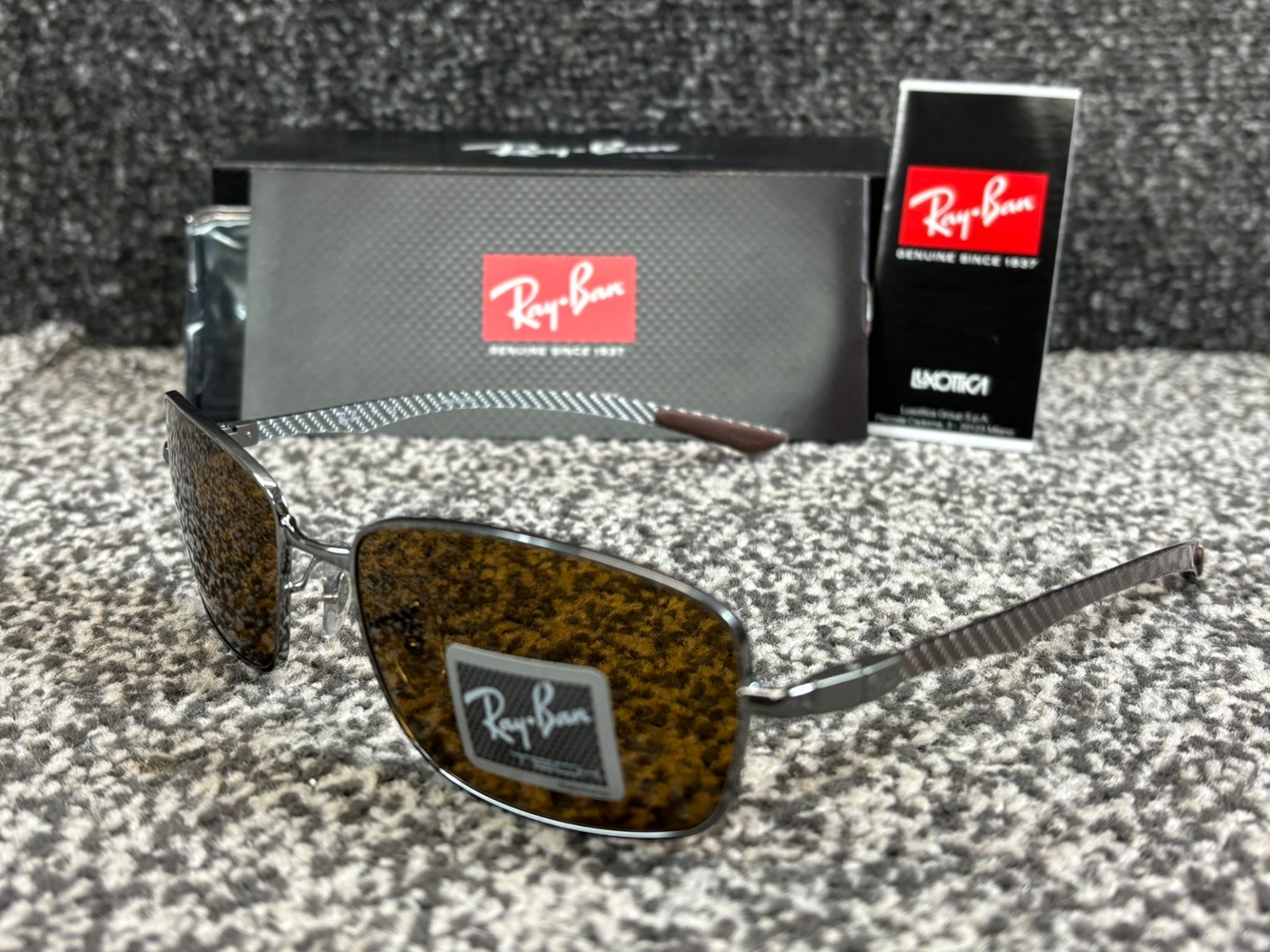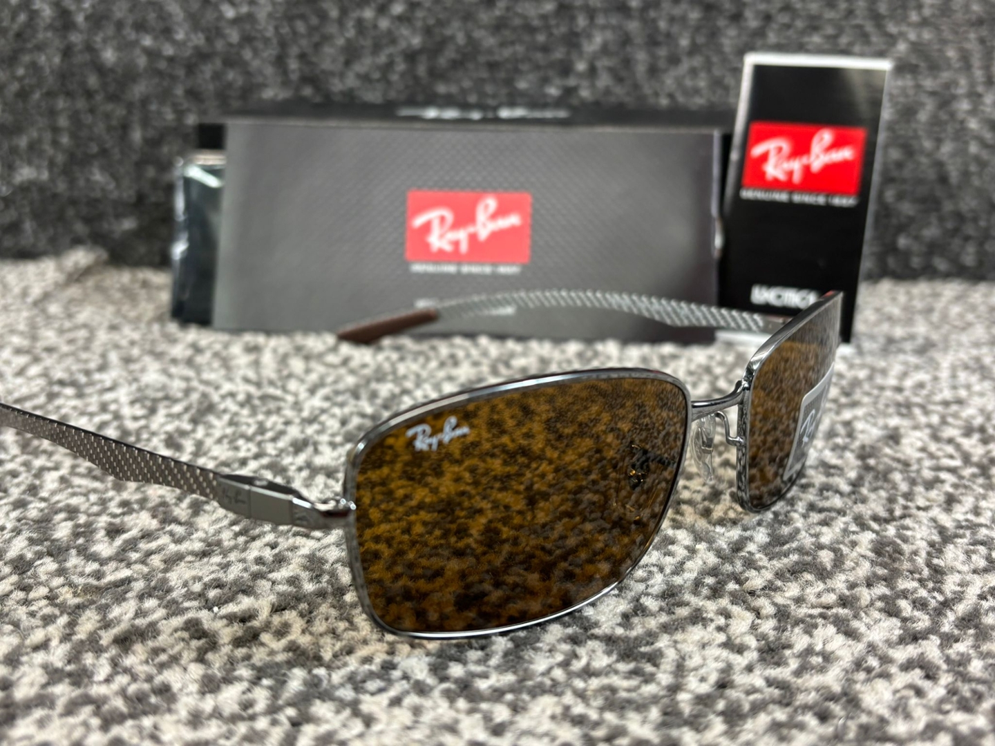 A brand new, unused, and boxed Ray-Ban RB8308 004 Gunmetal Carbon Fibre Sunglasses—where advanced materials meet iconic design. Crafted for the modern individual who demands both performance and style, this premium pair features a distinctive gunmetal frame paired with lightweight, ultra-durable carbon fibre temples for a supremely comfortable fit.