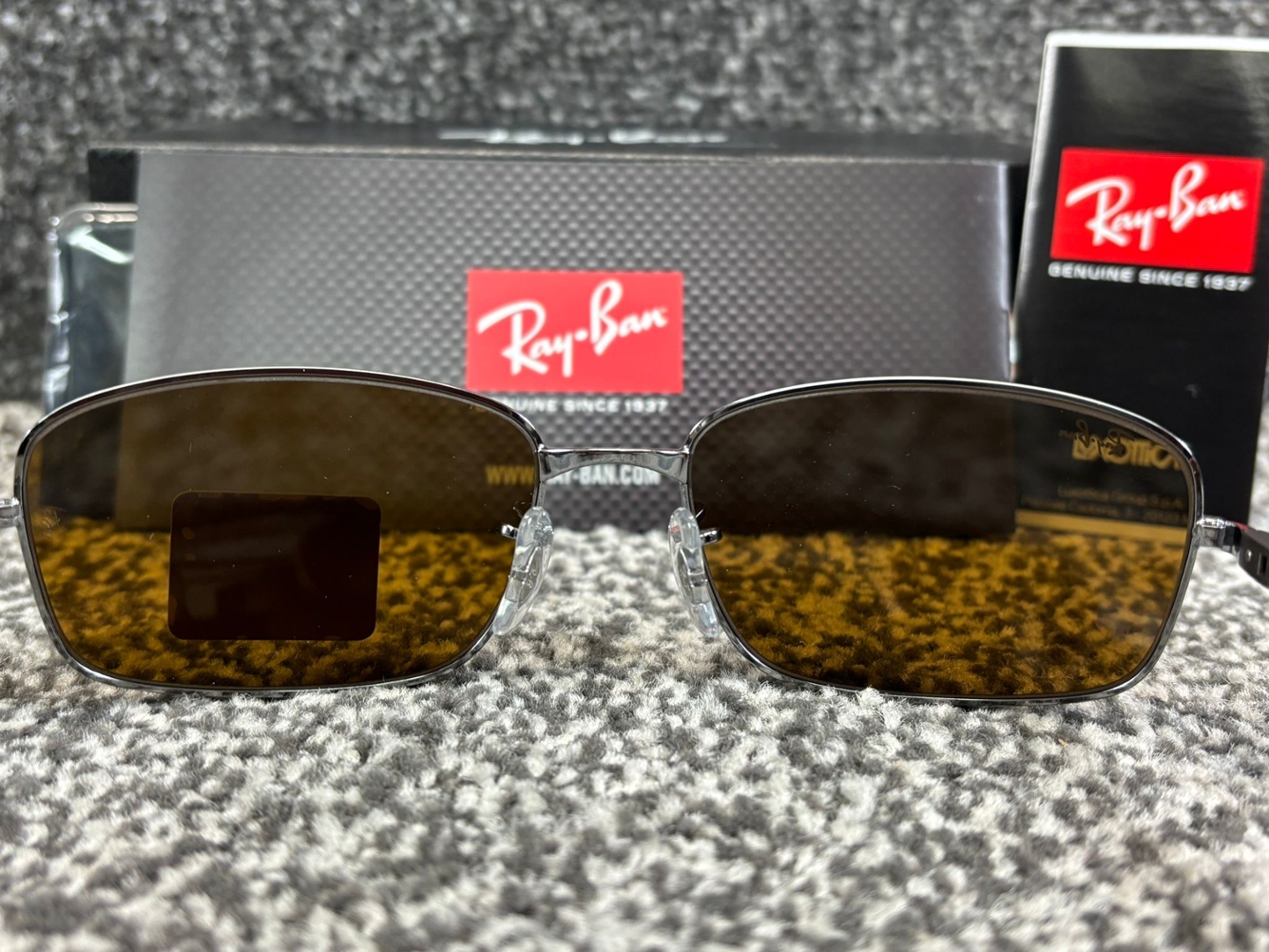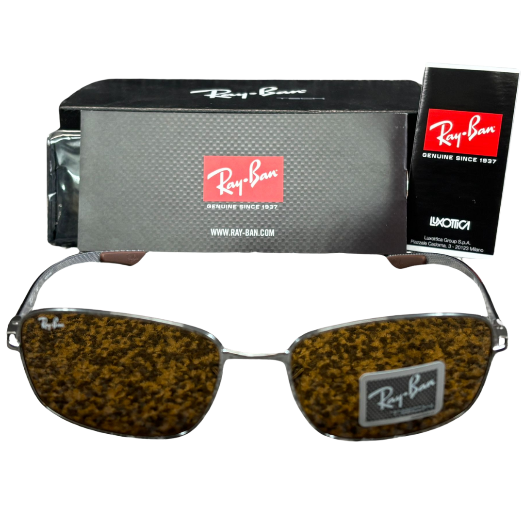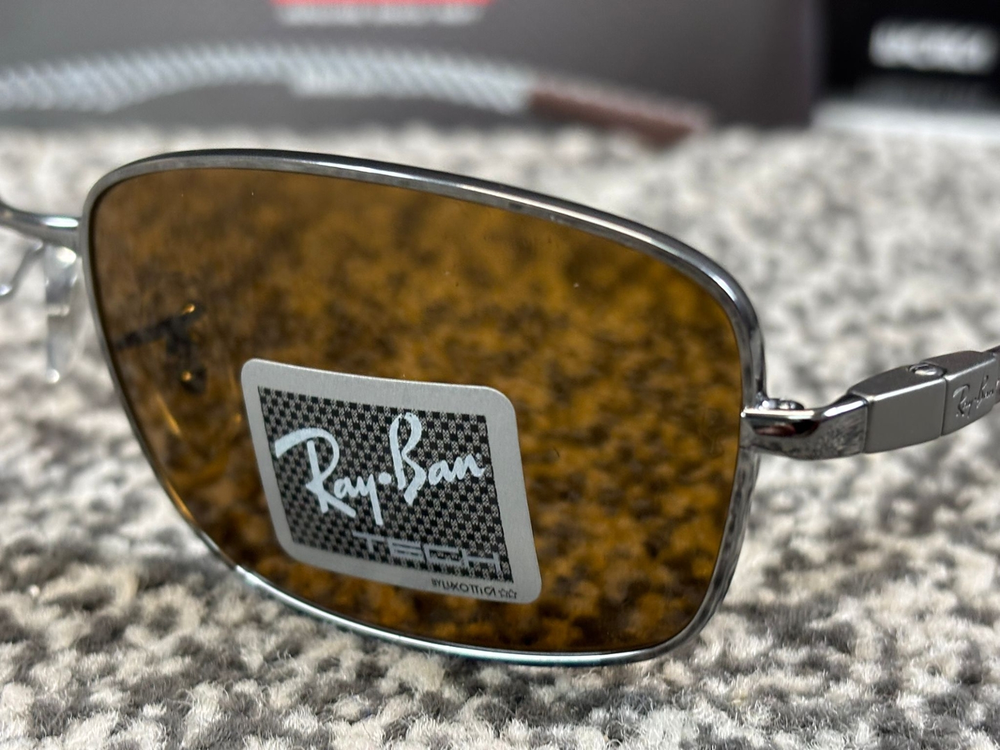 A brand new, unused, and boxed Ray-Ban RB8308 004 Gunmetal Carbon Fibre Sunglasses—where advanced materials meet iconic design. Crafted for the modern individual who demands both performance and style, this premium pair features a distinctive gunmetal frame paired with lightweight, ultra-durable carbon fibre temples for a supremely comfortable fit.