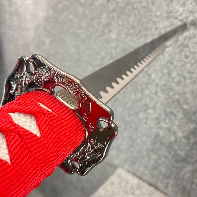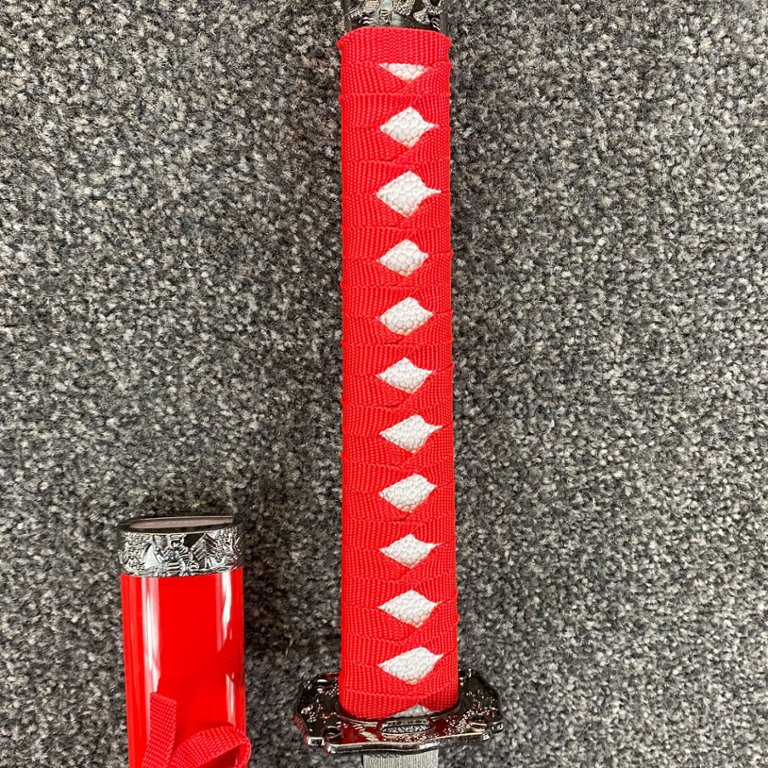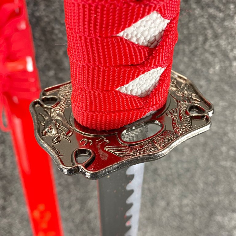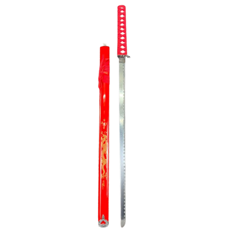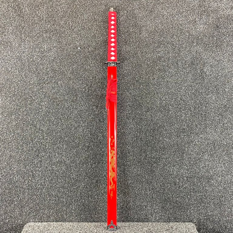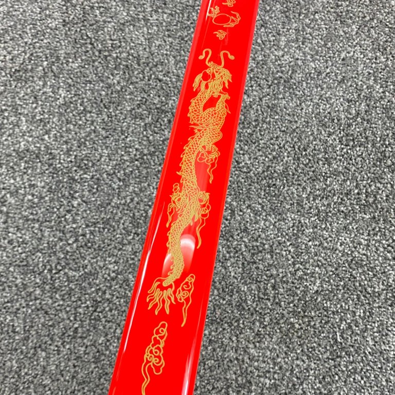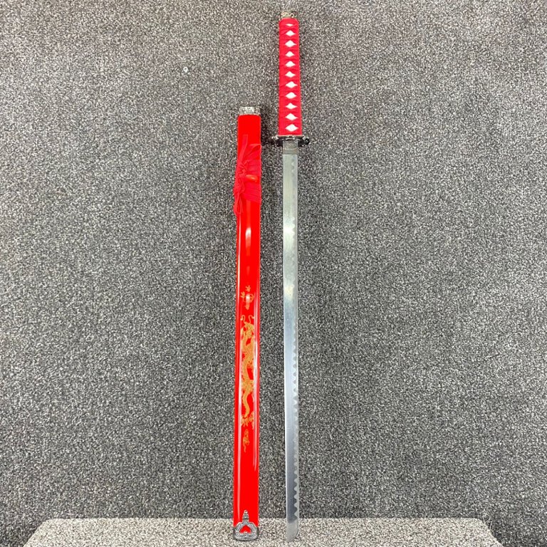 With an approximate overall length of 38 inches, this katana exudes elegance and strength. The blade is expertly designed to replicate the traditional curvature and razor-sharp edge of the katana, while intricate etchings along its length depict the majestic form of the fearsome red dragon.