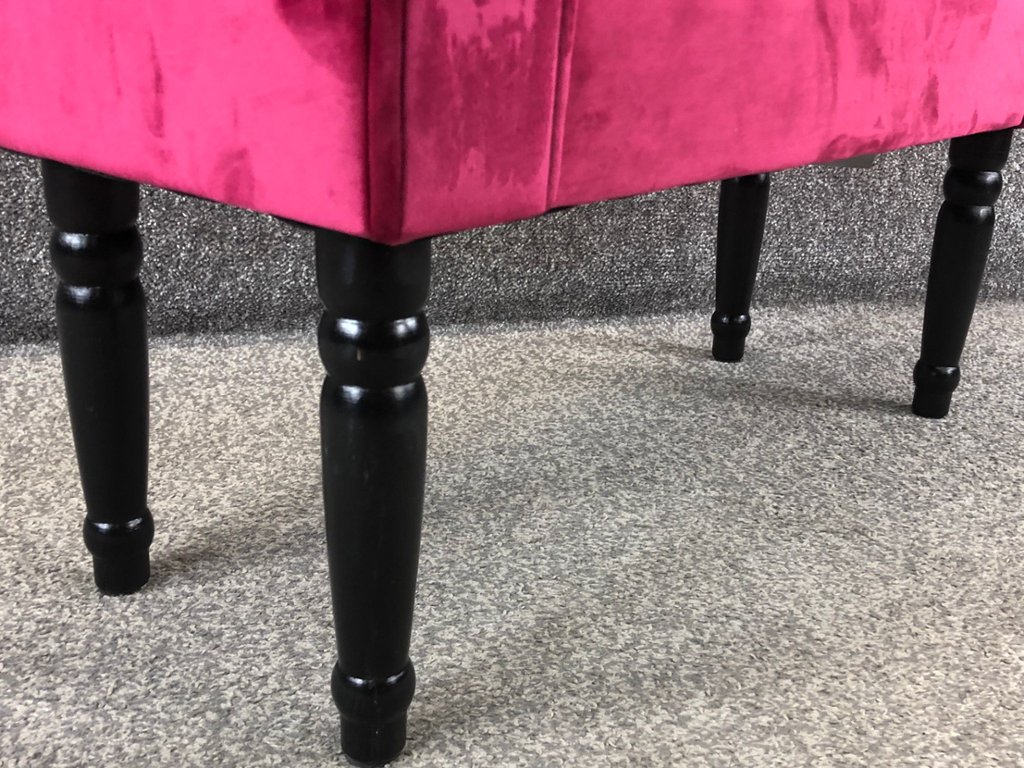 A red french velvet double ended daybed design foot stool on black wooden legs. Approx 20" height, 33" width, 12" depth.
