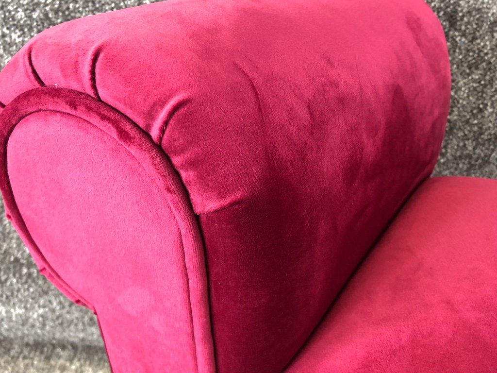 A red French velvet double-ended daybed-style footstool. The plush velvet upholstery radiates sophistication, offering both comfort and statement appeal. Its rich hue catches the light beautifully, creating a striking focal point that complements both modern and traditional interiors.