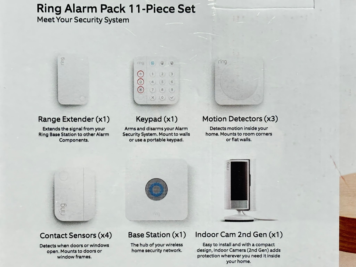 This comprehensive set includes an Indoor Cam (2nd Gen), keypad, base station and range extender, forming the core of the system. It is further enhanced with four contact sensors for doors and windows, alongside three motion detectors to provide wide interior coverage, ensuring every key access point and living space is effectively monitored.