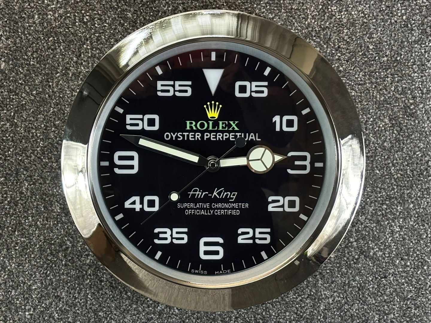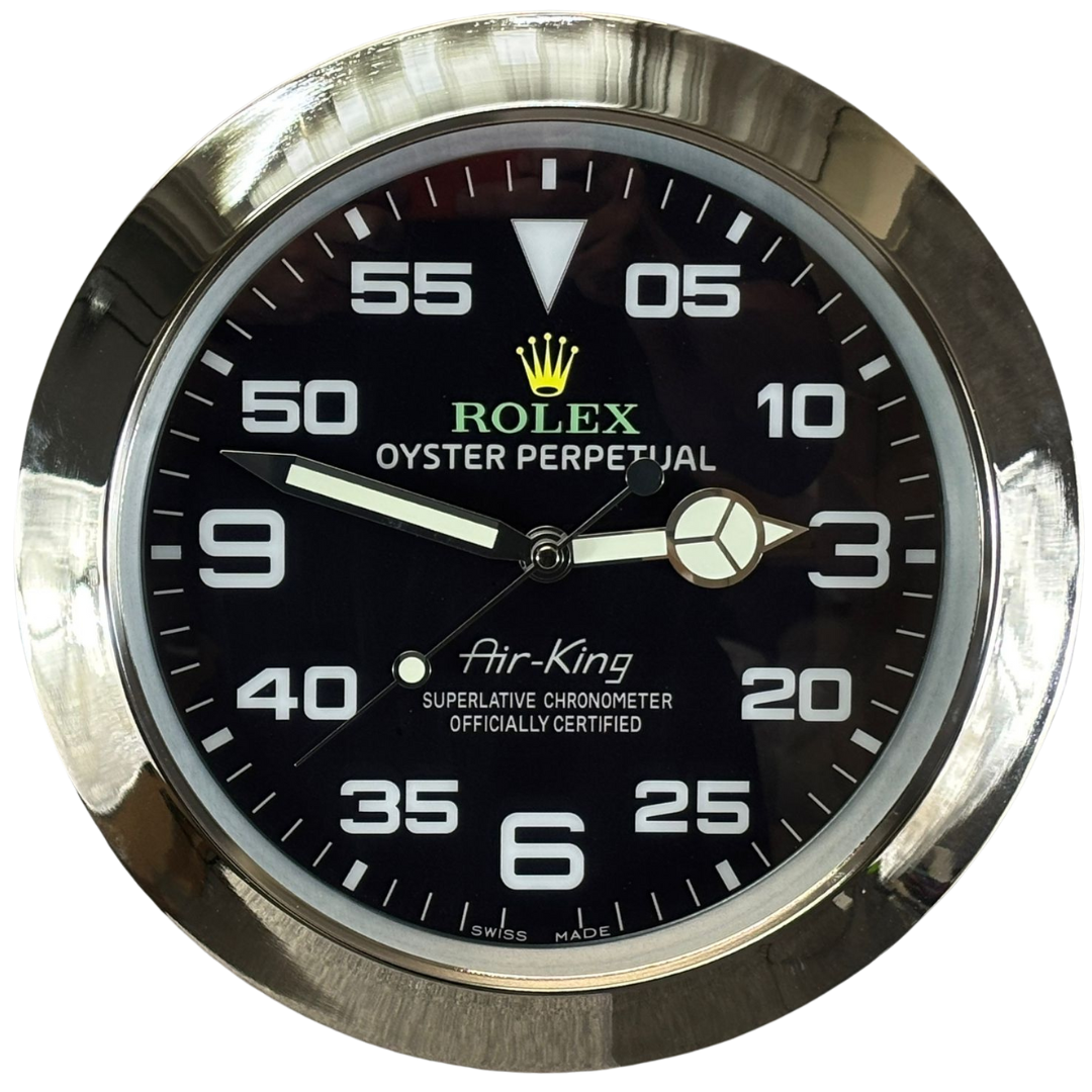 A stainless steel replica Rolex Air-King Black/Silver Wall Clock with a sweeping second hand. Approx 14" height, 14" width.