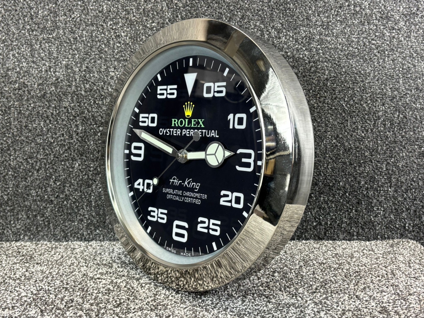 Astainless steel replica Rolex Air-King Wall Clock. Measuring approximately 14 inches in height and width, this dynamic piece pays tribute to one of Rolex’s most adventurous timepieces. The bold black dial is accented with large white Arabic numerals and a distinctive green and yellow Rolex logo, capturing the iconic look of the modern Air-King.
