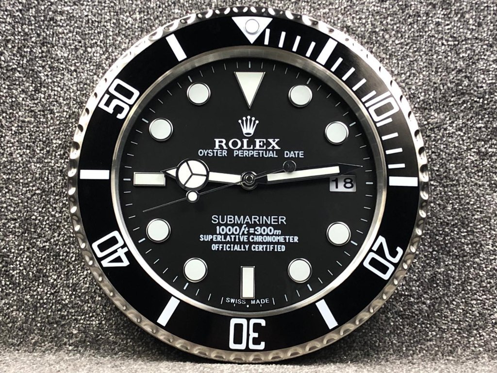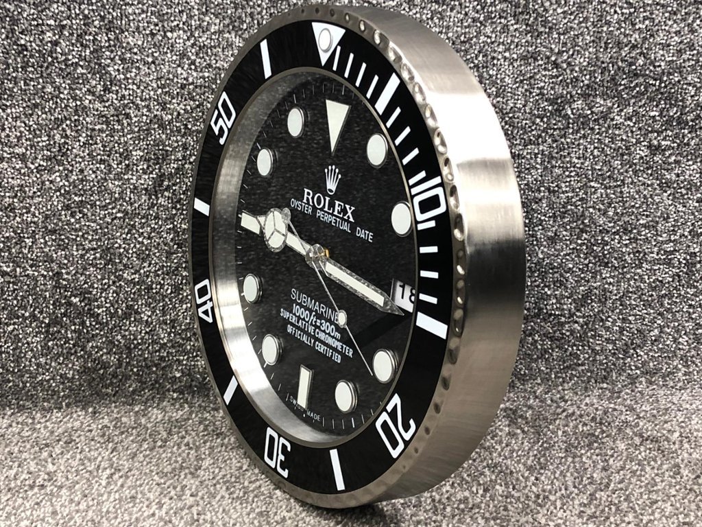 This replica wall clock is not only a decorative piece but also a functional one, featuring a practical date display at the 3 o'clock position, magnified for easy reading, just like the authentic Submariner watch. Additionally, the winder on the side adds to its realistic appearance and functionality, completing the look of this sophisticated timekeeper. Perfect for a home office, living room, or a high-end retail environment, the stainless steel replica Rolex Submariner wall clock is more than just a clock; it is a statement of luxury and refined taste. Its impeccable design and high-quality construction make it an ideal addition for enthusiasts and connoisseurs of fine timepieces.