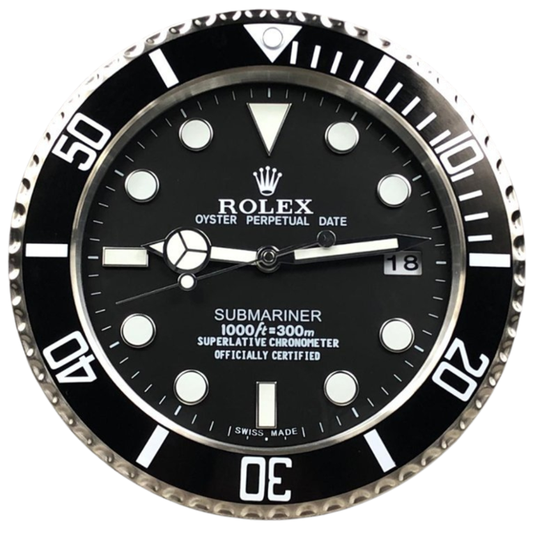 The stainless steel replica Rolex black face Submariner wall clock is an epitome of timeless elegance and meticulous craftsmanship, designed to bring the prestige of the renowned Rolex Submariner to your wall. Encased in a polished stainless steel frame, this wall clock radiates durability and sophistication, echoing the quality and luxury associated with the iconic Rolex brand. Measuring approximately 14 inches in height and width, its substantial presence makes it a captivating focal point in any setting.