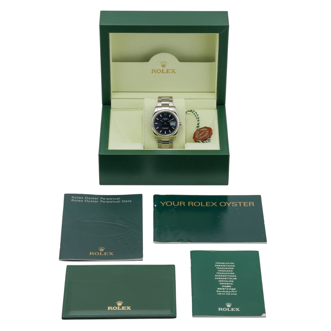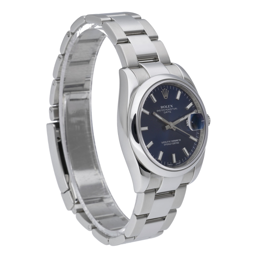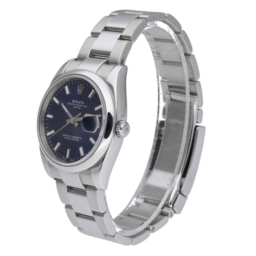A Rolex Date 115200 is a sophisticated, reliable timepiece that combines elegance and functionality. This 2008 model, crafted from stainless steel, features a deep blue dial for optimal legibility. The 34mm case size offers a slightly smaller yet refined presence, making it an excellent choice for those who prefer a more compact, classic watch.