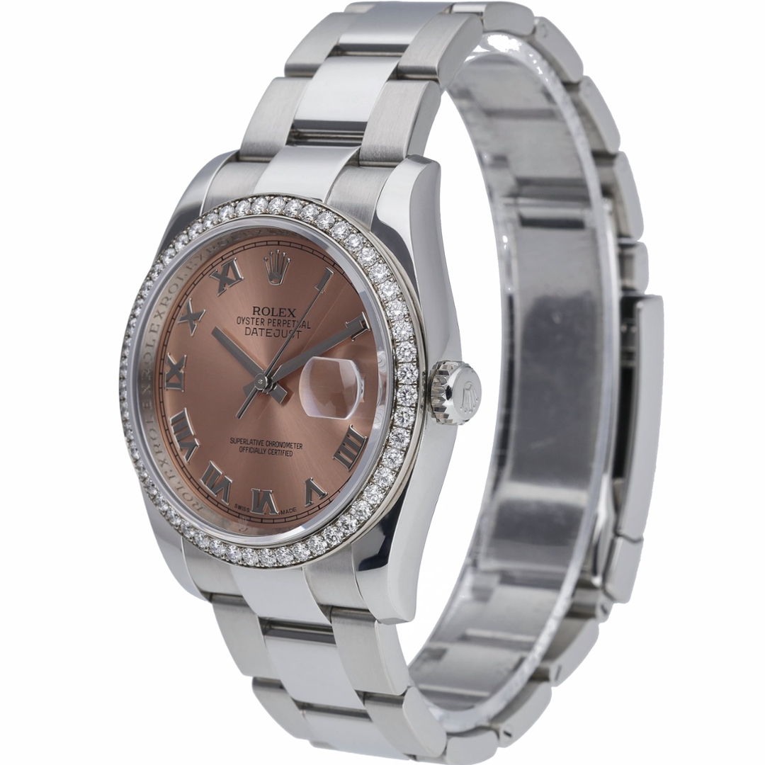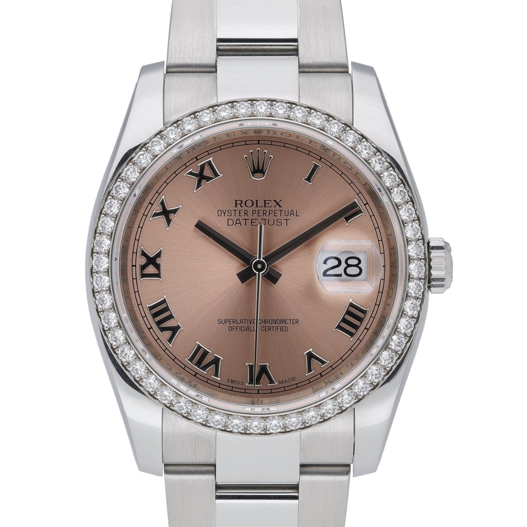 A Rolex Datejust 116244, this 36mm stainless-steel model features the highly desirable factory-set Rolex diamond bezel paired with a rare salmon dial — a combination increasingly sought after by collectors. The warm sunburst dial finish, complemented by black Roman numerals, gives this reference a distinctive, elegant presence that sets it apart from more common Datejust configurations. With the 1162-series now discontinued, well-preserved examples with original factory diamonds continue to perform well in the pre-owned market.