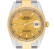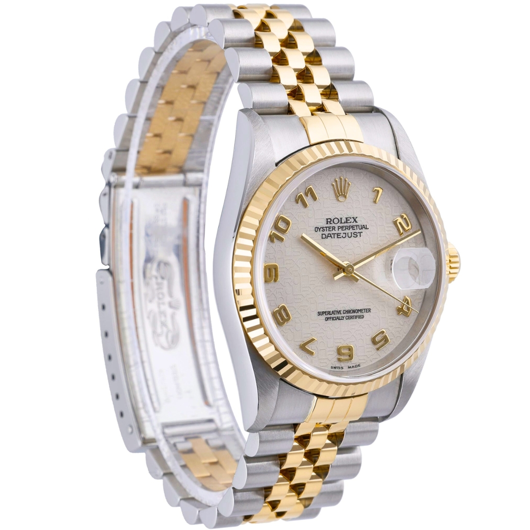 A Rolex Datejust 36 reference 16233, presented in stainless steel and 18ct yellow gold with a matching yellow gold fluted bezel and a distinctive cream dial. This 2000 example is offered in immaculate condition and represents one of the most recognisable and enduring configurations within the Datejust collection. The warm tone of the yellow gold bezel and centre links complements the elegant cream dial beautifully, while the applied gold Arabic numerals add a unique, characterful aesthetic rarely seen on standard Datejust models. The classic 36mm Oyster case maintains the perfectly balanced proportions that have made the Datejust a staple of the Rolex catalogue for decades.
