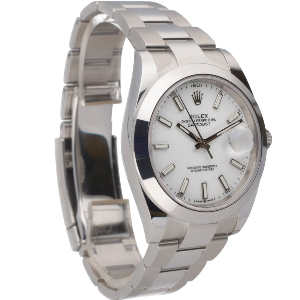 A Datejust 41 Rolex Watch, Stainless Steel on a White Dial.