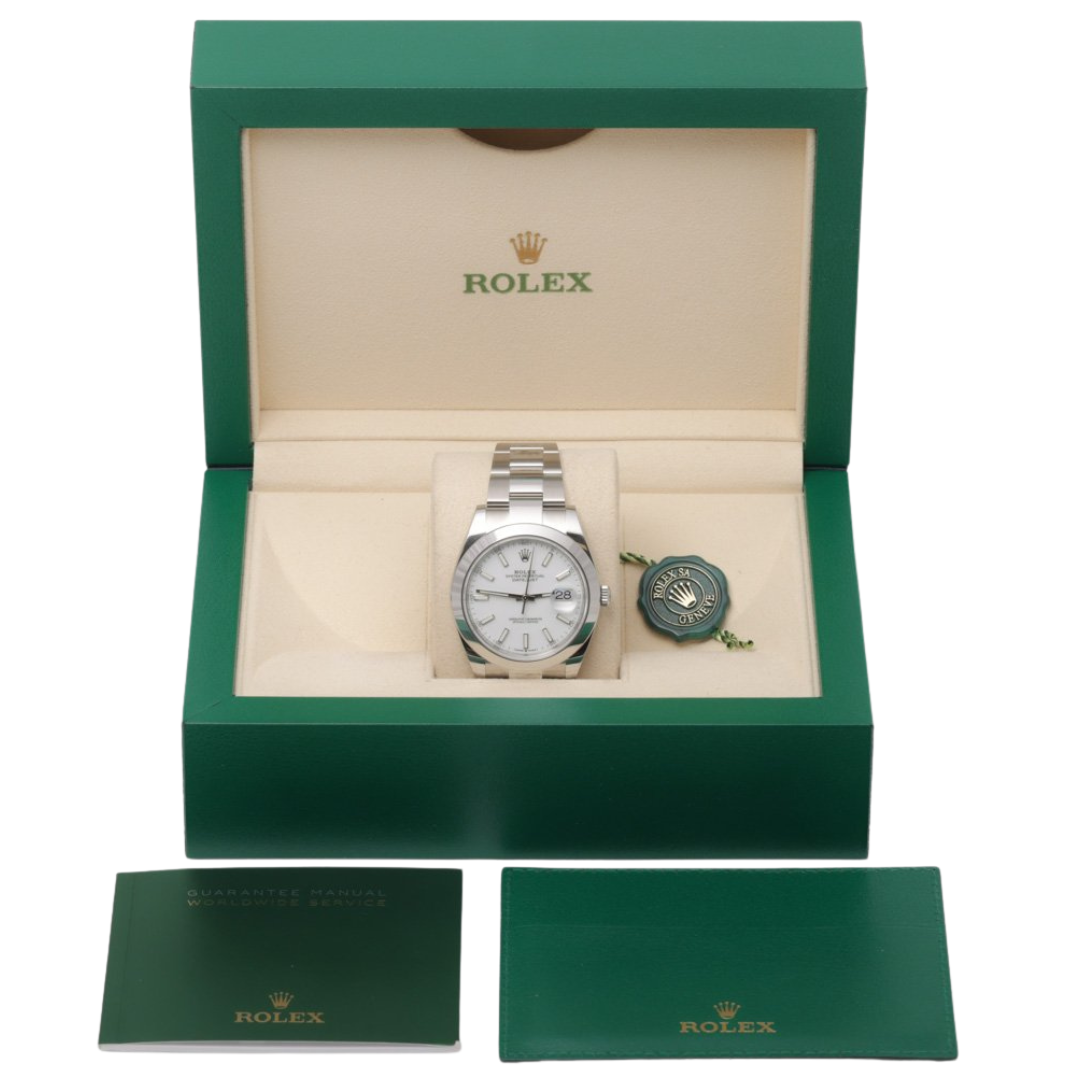 A Rolex Datejust 41, model 126300, embodies timeless sophistication and the precision engineering that defines the Rolex name. Crafted entirely from stainless steel, this 41mm model presents a clean, modern aesthetic, enhanced by its smooth domed bezel and elegant white dial. The dial features luminous baton hour markers and polished hands, offering exceptional legibility and understated refinement. The signature Cyclops lens magnifying the date display at three o’clock completes this unmistakably classic design.