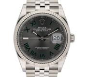 A Rolex Datejust 41 reference 126334, crafted from stainless steel and 18ct white gold, presented with the sought-after slate grey “Wimbledon” dial — featuring distinctive green Roman numerals and a refined sunray finish that shimmers under light. The fluted 18ct white gold bezel adds a sophisticated touch, perfectly complementing the sporty elegance of the Oyster bracelet.