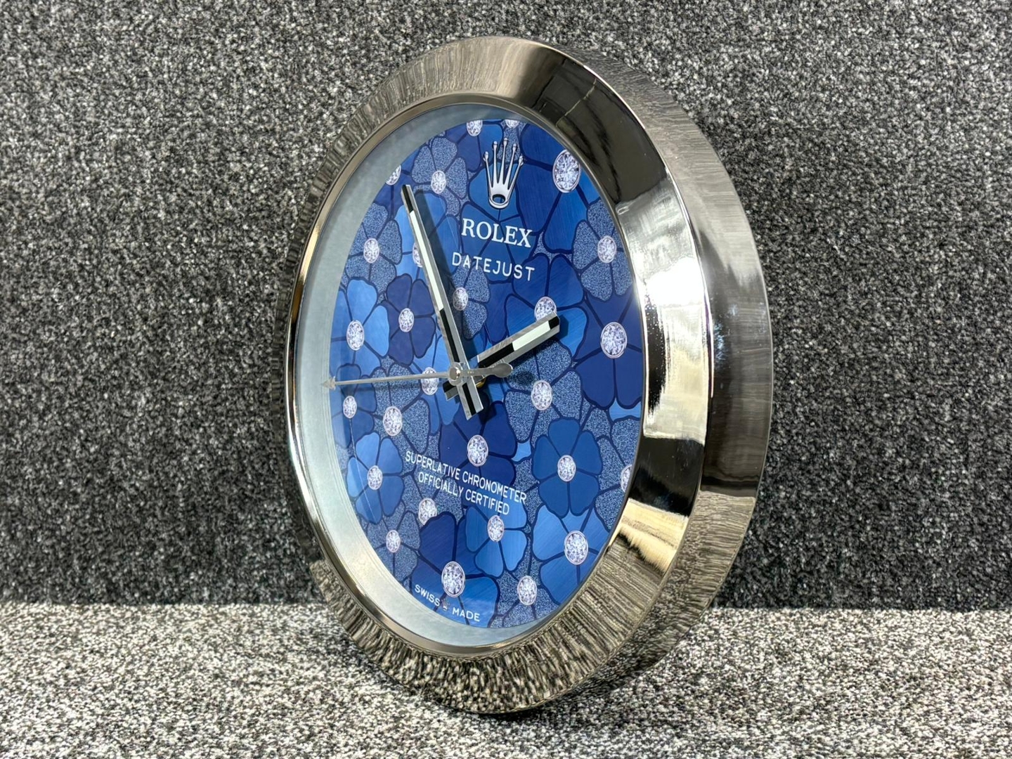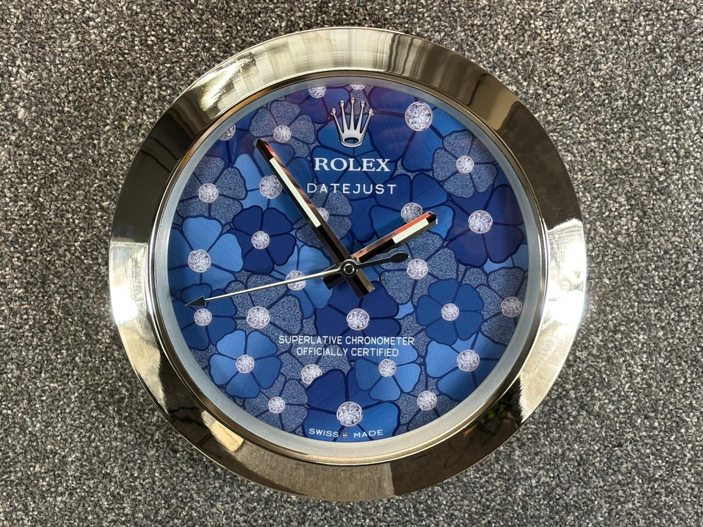 A stainless steel replica Rolex Datejust Azzuro Blue Floral Wall Clock. Measuring approximately 14 inches in height and width, this striking timepiece is a bold decorative nod to one of Rolex’s most enchanting dial designs.