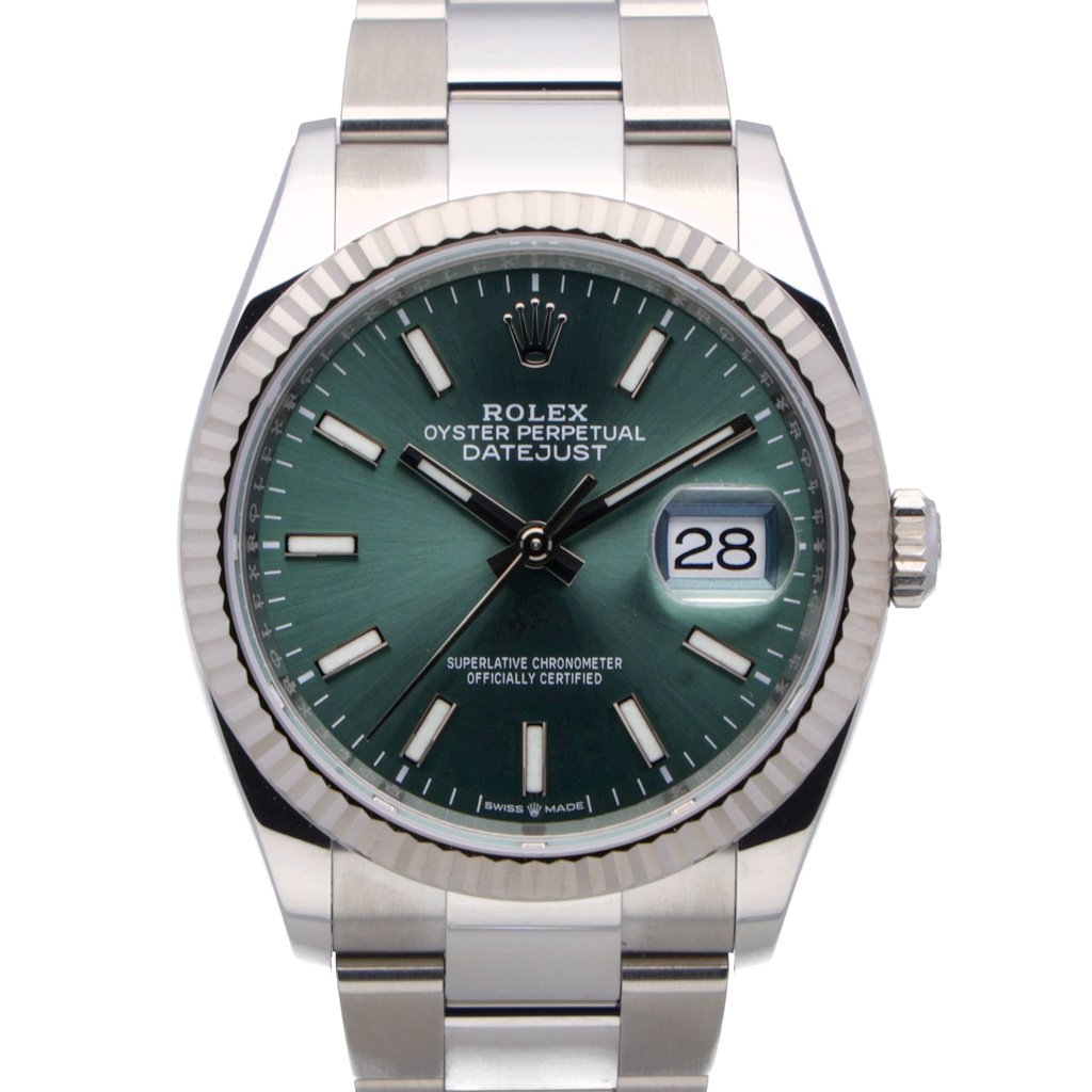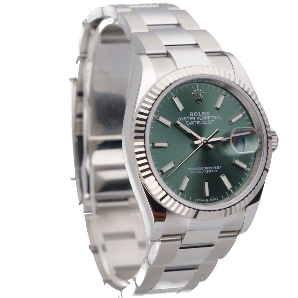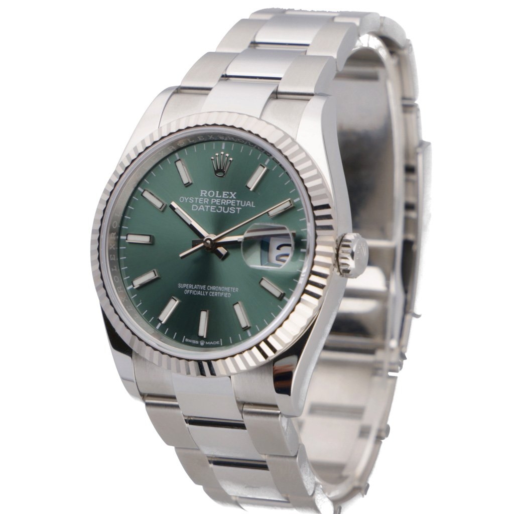 A Rolex Datejust 36, model 126234, perfectly captures the essence of timeless sophistication with a modern, refreshing twist. Crafted from stainless steel and 18ct white gold, this 36mm model features the iconic fluted bezel — a hallmark of Rolex’s enduring elegance. The standout mint green dial adds a contemporary vibrance, complemented by luminous baton hour markers and polished hands that ensure exceptional clarity and legibility. The signature Cyclops lens magnifies the date display at three o’clock, completing the watch’s instantly recognisable design.