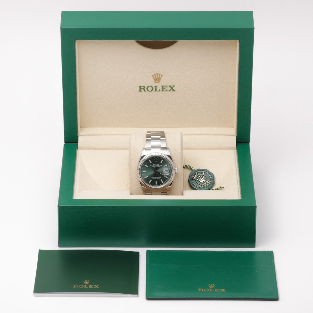Dated 2022 and presented in immaculate condition, this example is accompanied by its original Rolex box, full set of paperwork, and certification. Backed by the Rolex manufacturer's warranty until 2027, it offers peace of mind and enduring quality. The Datejust 36 with a mint green dial represents a perfect harmony of innovation, craftsmanship, and contemporary elegance — a truly distinctive addition to any collection.