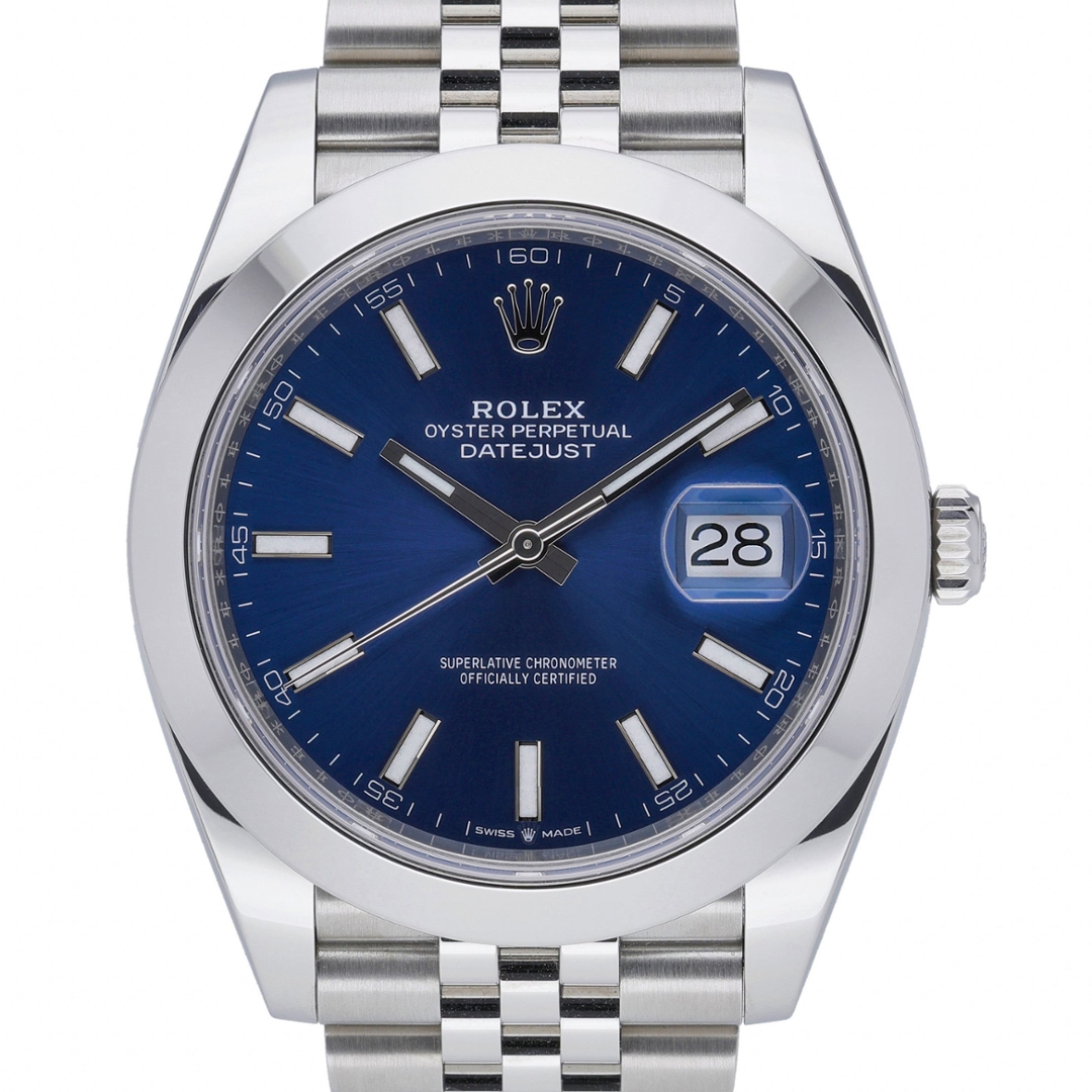 A Rolex Datejust 41, reference 126300, crafted in stainless steel and presented with a striking blue dial. The 41mm Oyster case delivers balanced wrist presence, while the smooth bezel maintains a clean, contemporary profile. The vibrant sunburst blue dial features luminous baton hour markers and a classic date display at 3 o’clock beneath the Cyclops lens, offering sharp legibility and timeless appeal.