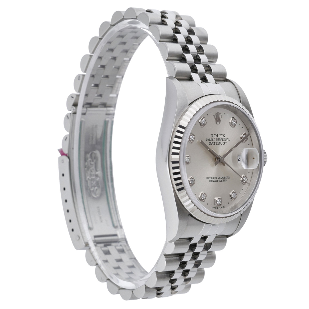 A Rolex Datejust 36, model 16234, is a true emblem of timeless sophistication and refined craftsmanship. Crafted from stainless steel and crowned with an 18ct white gold fluted bezel, this elegant timepiece perfectly captures the enduring appeal of the classic Datejust design. The silver dial, set with original factory Rolex diamond hour markers, reflects understated luxury while maintaining impeccable readability and balance.