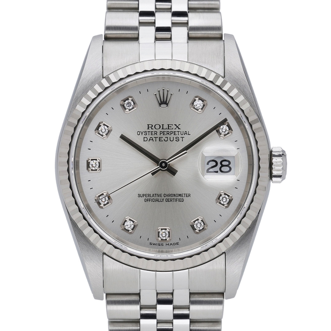 A Rolex Datejust Watch, Stainless Steel with a White Gold Bezel on a Silver Dial with Diamond Numerals