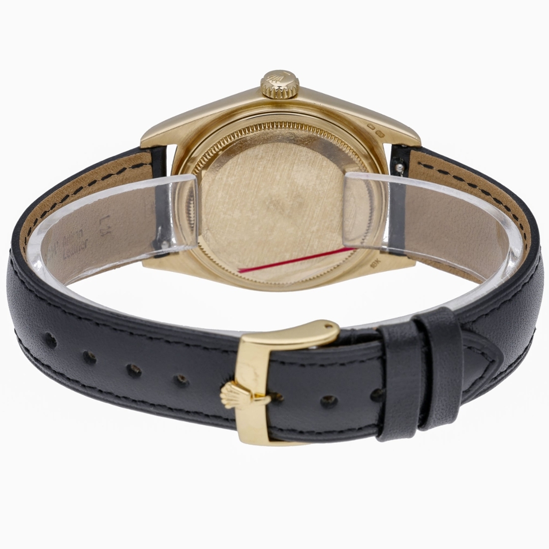 This Rolex Datejust reference 16018 features the classic 36mm Oyster case crafted entirely from 18ct yellow gold, paired with a matching yellow gold fluted bezel. The champagne dial is fitted with applied baton hour markers and gold hands, framed by an acrylic crystal with cyclops date magnification. Presented on a black leather strap, this configuration offers a more understated take on a traditionally bracelet-fitted reference.