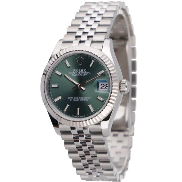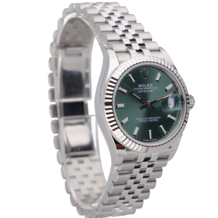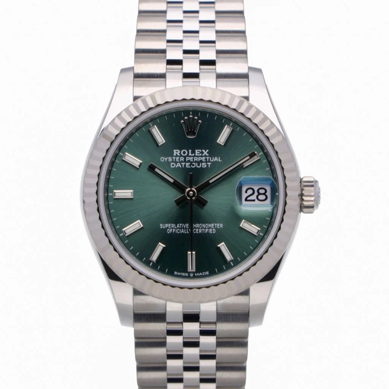 A Rolex Datejust 31 278274 is presented in stainless steel with an 18ct white gold fluted bezel, paired with a mint green dial that adds a fresh, contemporary character to this classic design. The 31mm Oyster case offers elegant proportions, while baton hour markers and polished hands ensure excellent readability. The Jubilee bracelet enhances comfort and adds a refined touch to the overall aesthetic.
