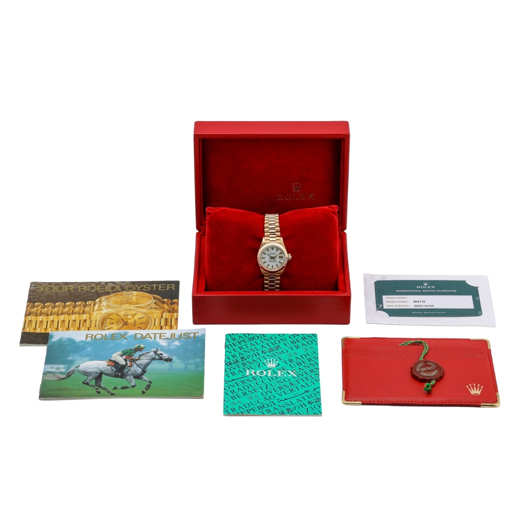 At the heart of the watch is the Rolex Calibre 2135 automatic movement, a reliable in-house movement developed specifically for Rolex’s smaller Datejust models. Known for its durability and precision, the movement features a quick-set date function displayed beneath the iconic Cyclops magnification at 3 o’clock. The solid 18ct yellow gold President bracelet further enhances the watch’s classic aesthetic, providing both comfort and unmistakable prestige on the wrist.
