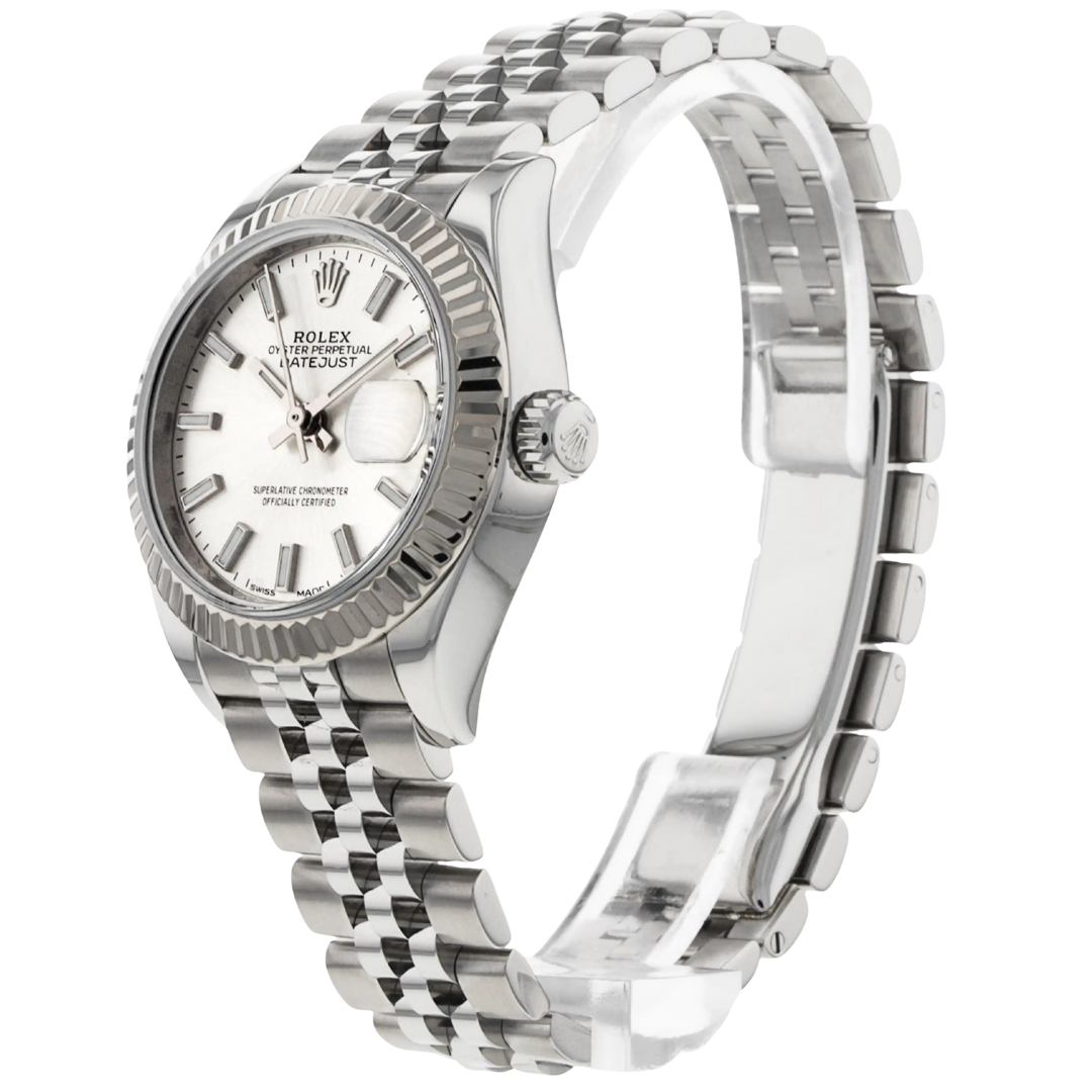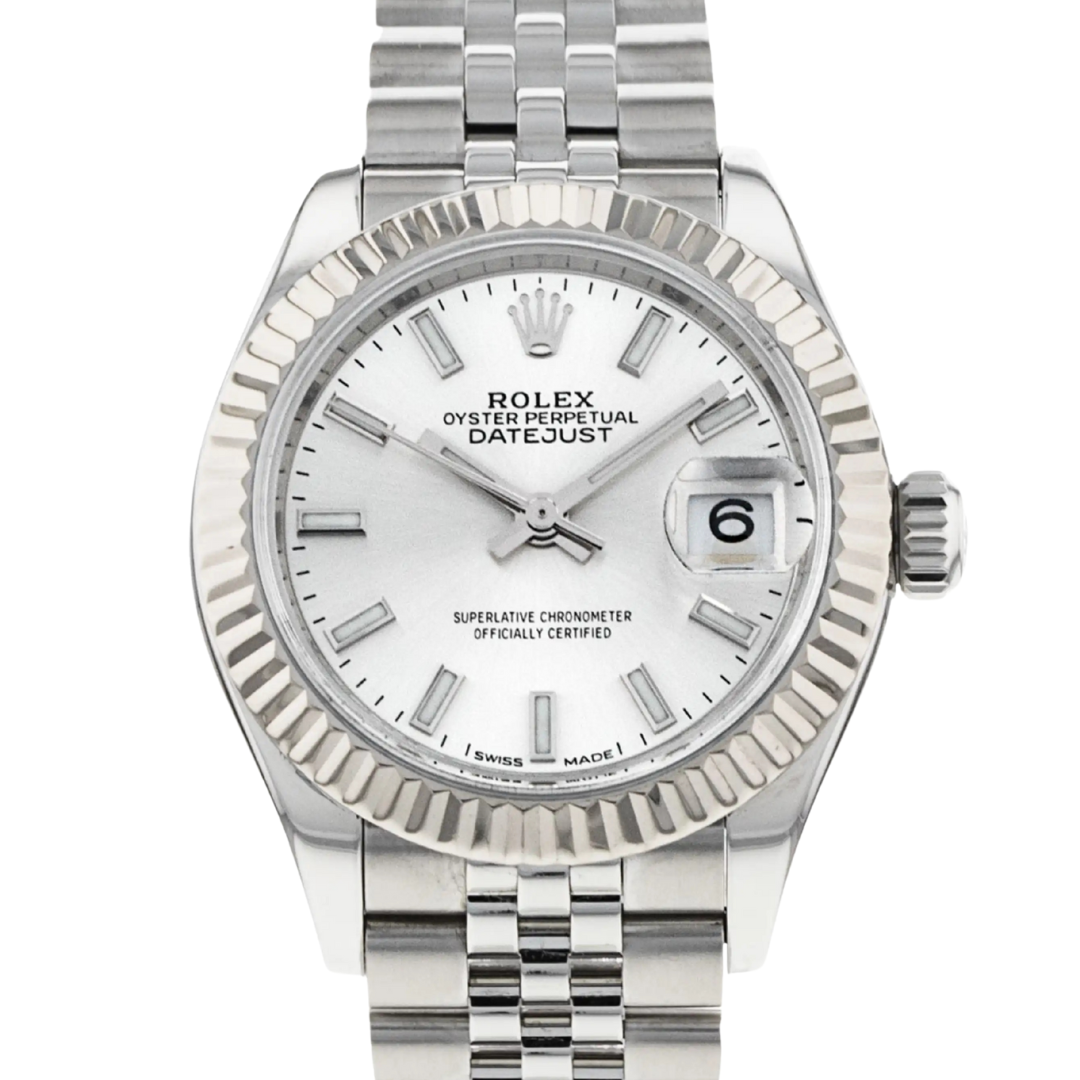 This 2019 Rolex Datejust 28 reference 279174 presents a clean and timeless configuration, pairing a crisp white dial with the signature 18ct white gold fluted bezel. The 28mm Oystersteel case offers a refined and elegant profile, ideal for daily wear yet unmistakably part of the modern Datejust line. The white dial keeps the aesthetic bright and classic, with white-gold hands and baton hour markers ensuring strong legibility and a balanced, uncluttered layout.