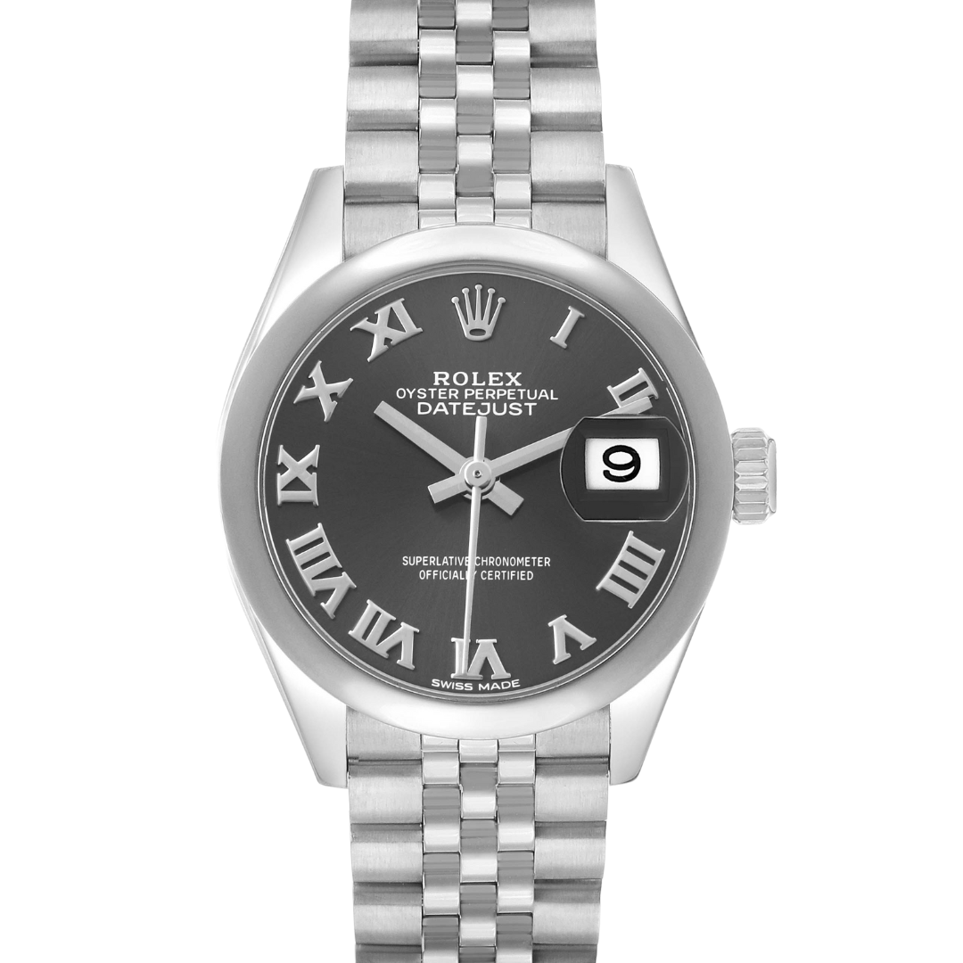 This Rolex Datejust 279160 offers a refined, increasingly sought-after entry point into modern Rolex ownership, combining timeless design with long-term collectability. The 28mm Oyster case in stainless steel is paired with a smooth bezel and a dark grey dial featuring applied Roman numerals, a configuration valued for its versatility and enduring appeal within the Datejust line.