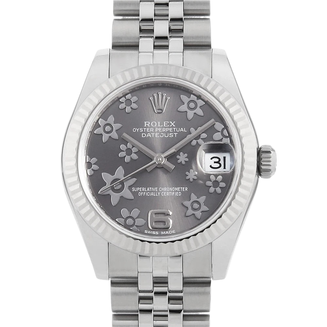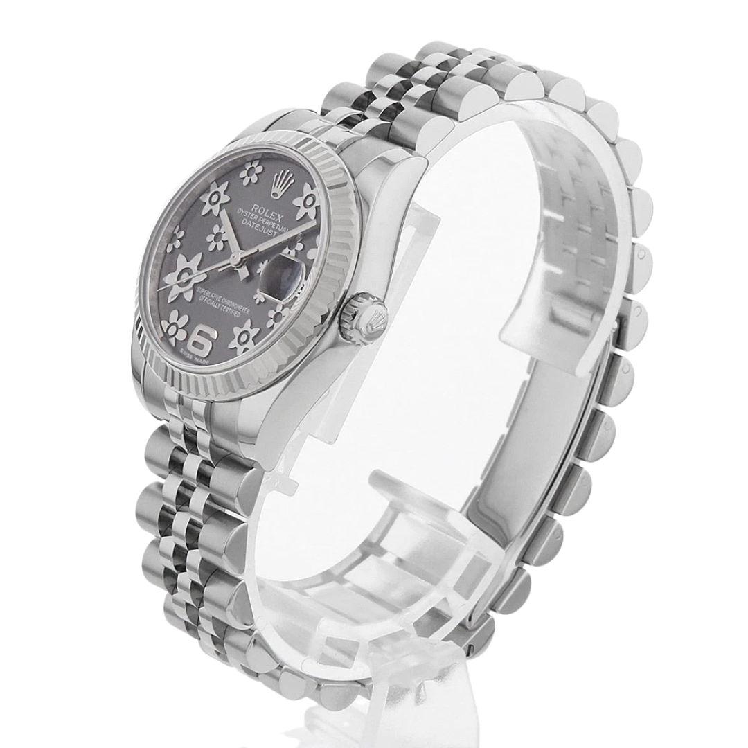 A Rolex Datejust 31 Watch, reference 178274, presented in immaculate condition and offered as a complete set. This model features a stainless steel case paired with an 18ct white gold fluted bezel, complemented by the distinctive grey floral dial. The applied floral motifs and Arabic numeral at 6 o’clock give this dial a refined yet characterful aesthetic that sets it apart from standard Datejust configurations.
