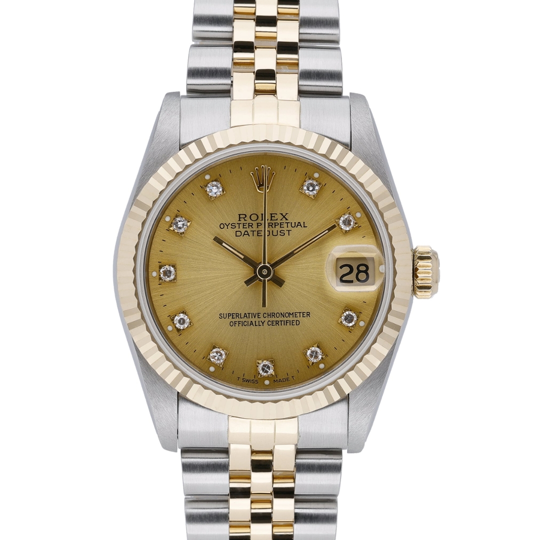 This Rolex Datejust reference 68273 is presented in immaculate condition, crafted in stainless steel and 18ct yellow gold. The 31mm Oyster case is fitted with an 18ct yellow gold fluted bezel and paired with a classic Jubilee bracelet, delivering the timeless two-tone aesthetic that defines the Datejust line. The champagne dial is set with original Rolex diamond hour markers, adding refined brilliance while maintaining elegant balance and legibility.