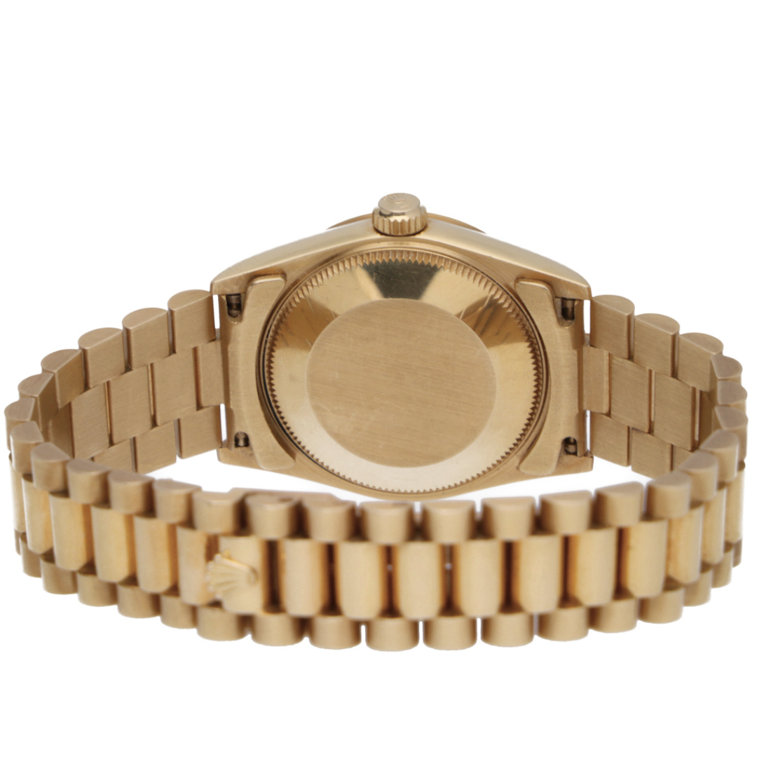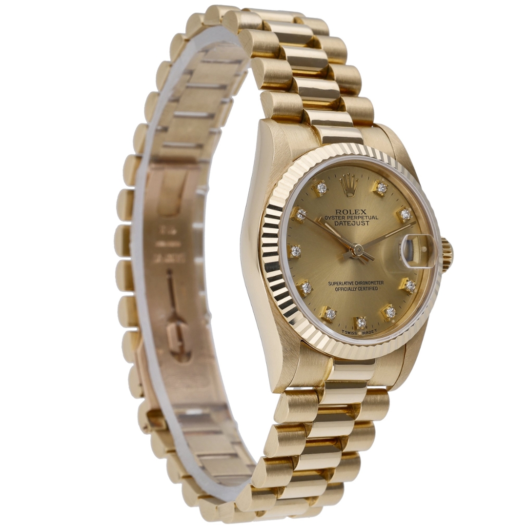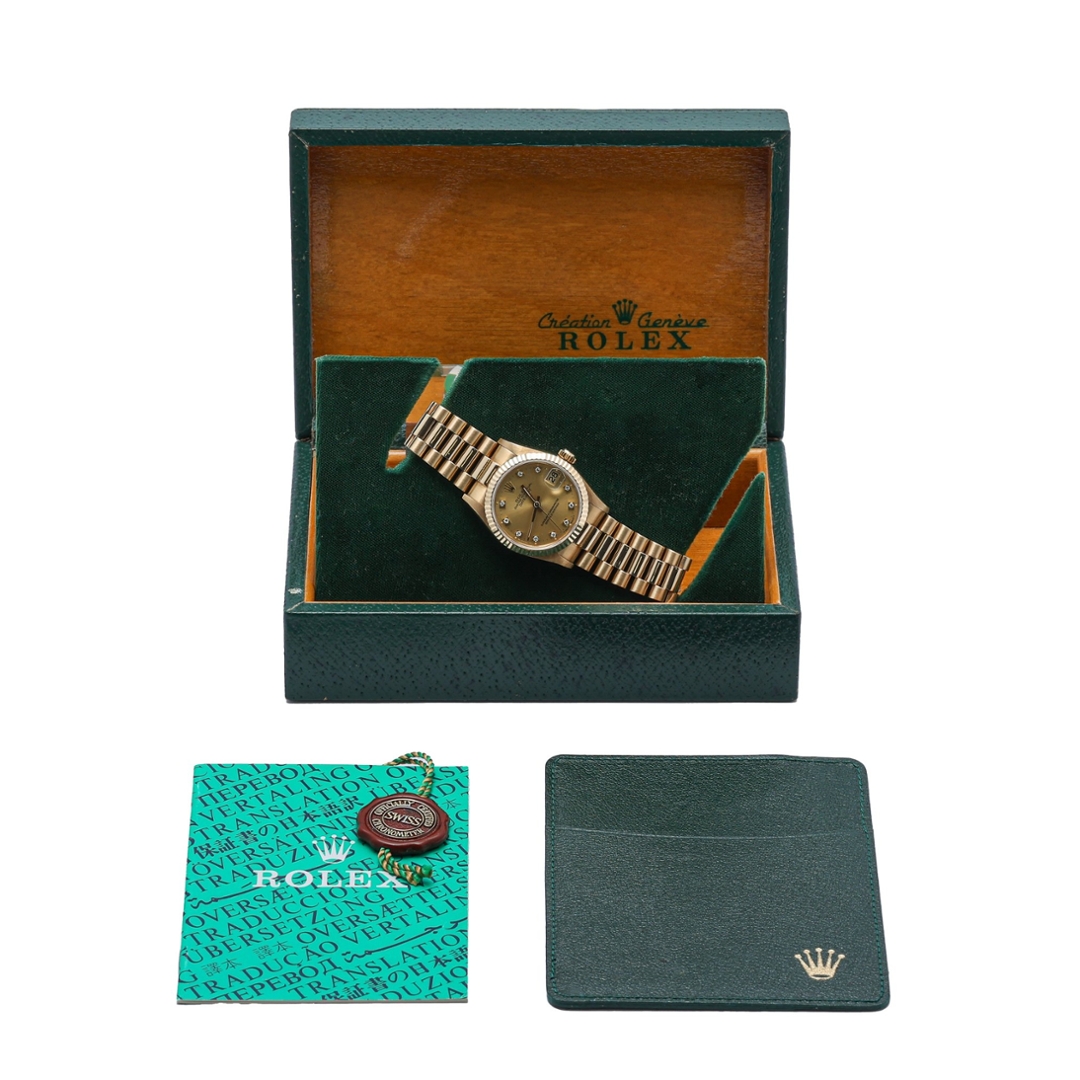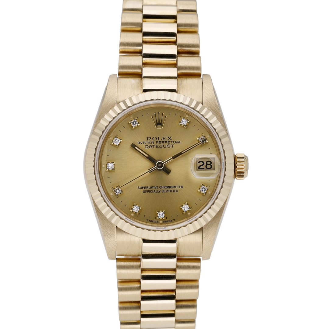 A Rolex Datejust reference 68278, crafted entirely in 18ct yellow gold and presented with a matching fluted bezel and champagne dial set with diamond hour markers. This 1989 example is offered in immaculate condition and perfectly captures the enduring elegance of vintage Rolex design. The warm tone of the yellow gold case and President-style bracelet complements the rich champagne dial beautifully, while the factory-set diamond numerals add a refined touch of luxury without overwhelming the classic Datejust aesthetic. The 31mm case size offers a timeless, balanced presence on the wrist.