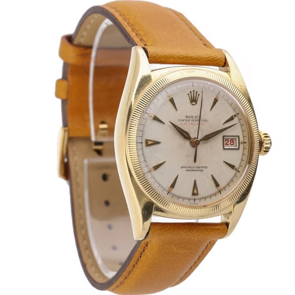 A Rolex Datejust Model 6105, crafted in 1953, epitomises timeless elegance and meticulous craftsmanship. Encased in lustrous 18ct yellow gold, the watch features a 36mm case that exudes sophistication. The striking white dial serves as a canvas for the classic Rolex hour markers and hands, offering clear readability and a touch of refinement.
