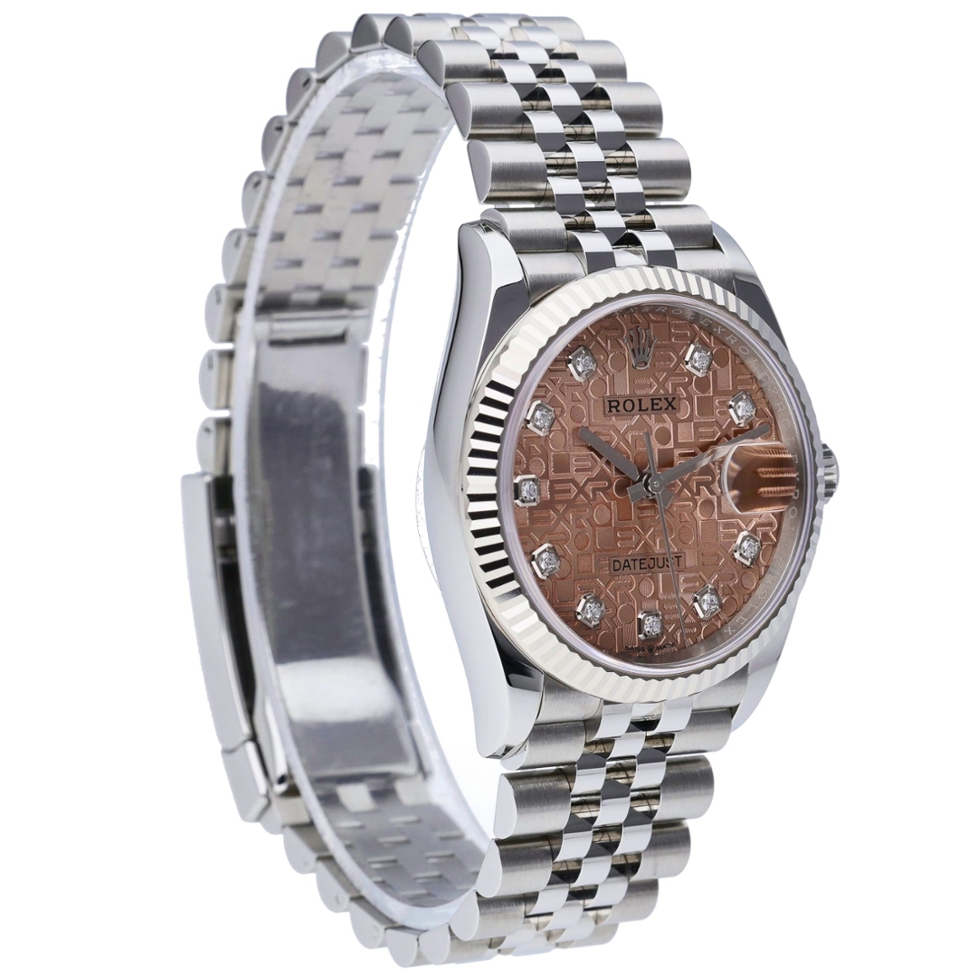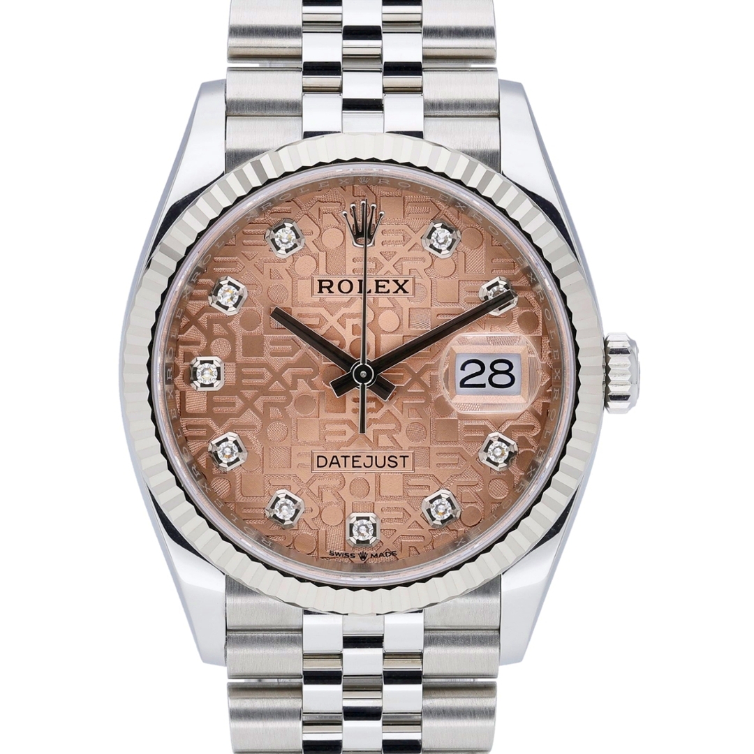A Rolex Datejust watch offers a refined and contemporary take on one of the brand’s most enduring designs. Crafted from stainless steel, the 36mm case is paired with an 18ct white gold fluted bezel, adding classic Rolex elegance and subtle brilliance. The salmon Jubilee dial is a standout feature, displaying a repeating Rolex motif and set with original diamond numerals that provide both texture and understated luxury. Finished on the iconic Jubilee bracelet, the overall aesthetic is balanced, dress-forward, and unmistakably Rolex.