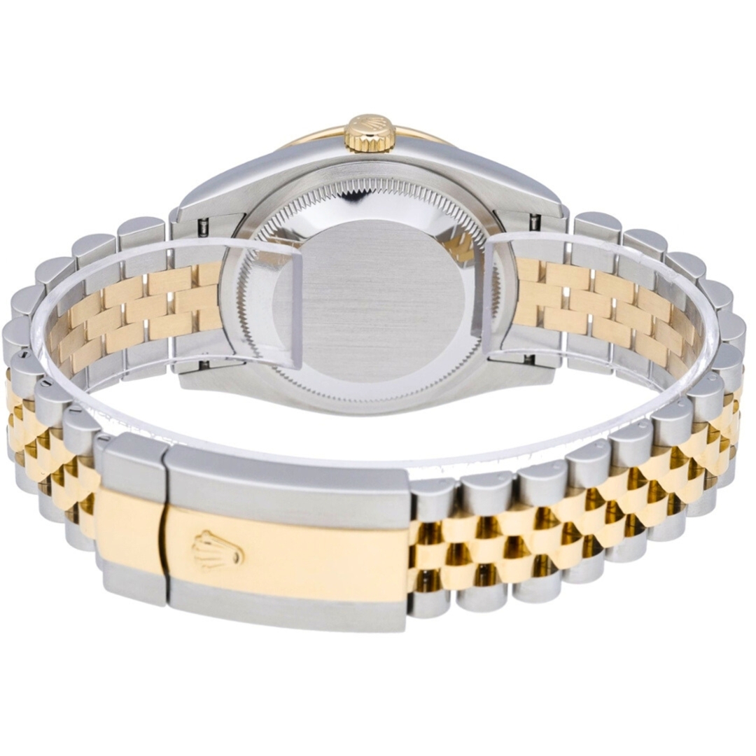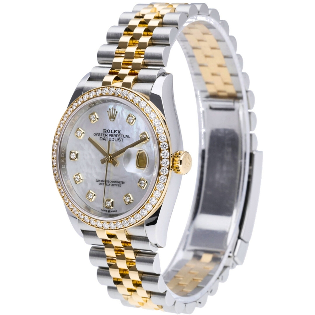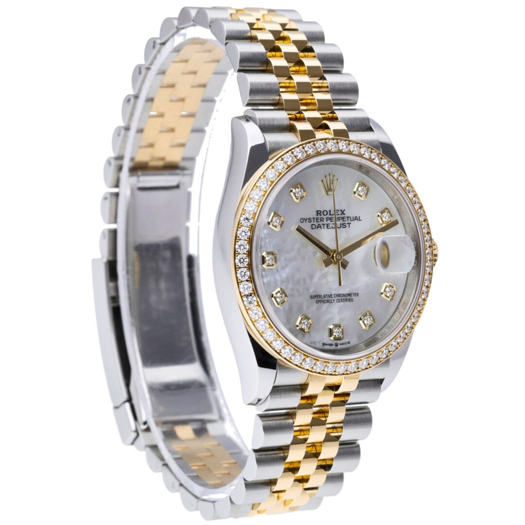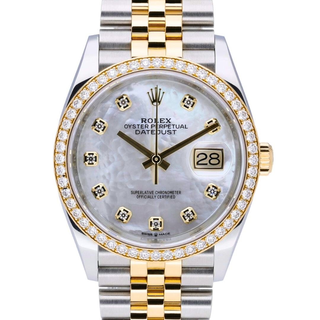 A Rolex Datejust 36 126283RBR, crafted in stainless steel and 18ct yellow gold, featuring a factory diamond-set bezel and a luminous mother-of-pearl dial with original Rolex diamond numerals. The natural iridescence of the dial shifts subtly across light conditions, complemented by the warmth of yellow gold throughout the case, crown, and Jubilee bracelet. At 36mm, the proportions remain timeless and highly versatile.