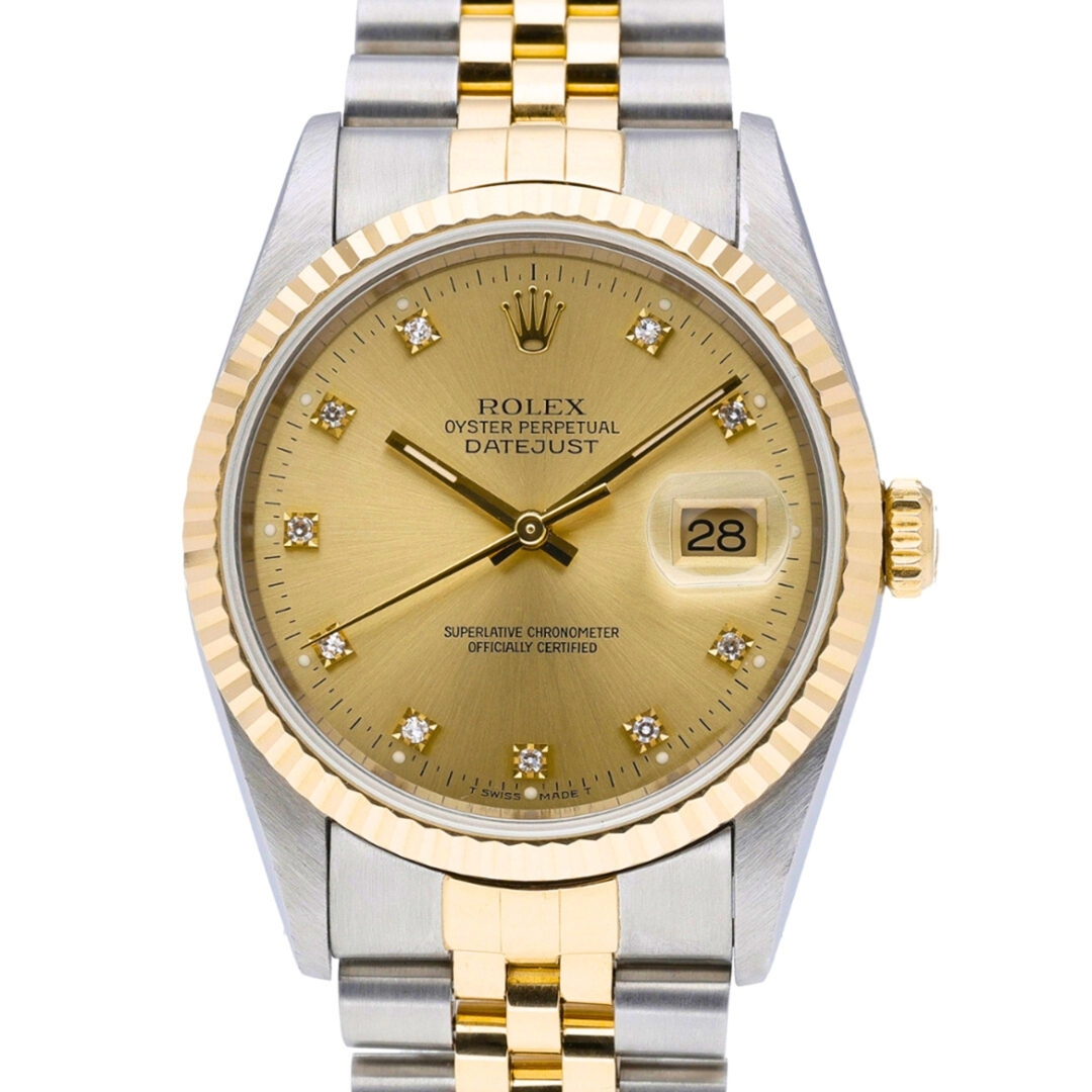 The champagne sunburst dial is fitted with original Rolex diamond-set hour markers in yellow gold settings, offering subtle brilliance against the warm dial tone. The applied coronet at 12 o’clock and the date aperture at 3 o’clock, complete with Cyclops lens, maintain the classic Datejust layout. The dial, handset, and detailing are all consistent with factory specifications.