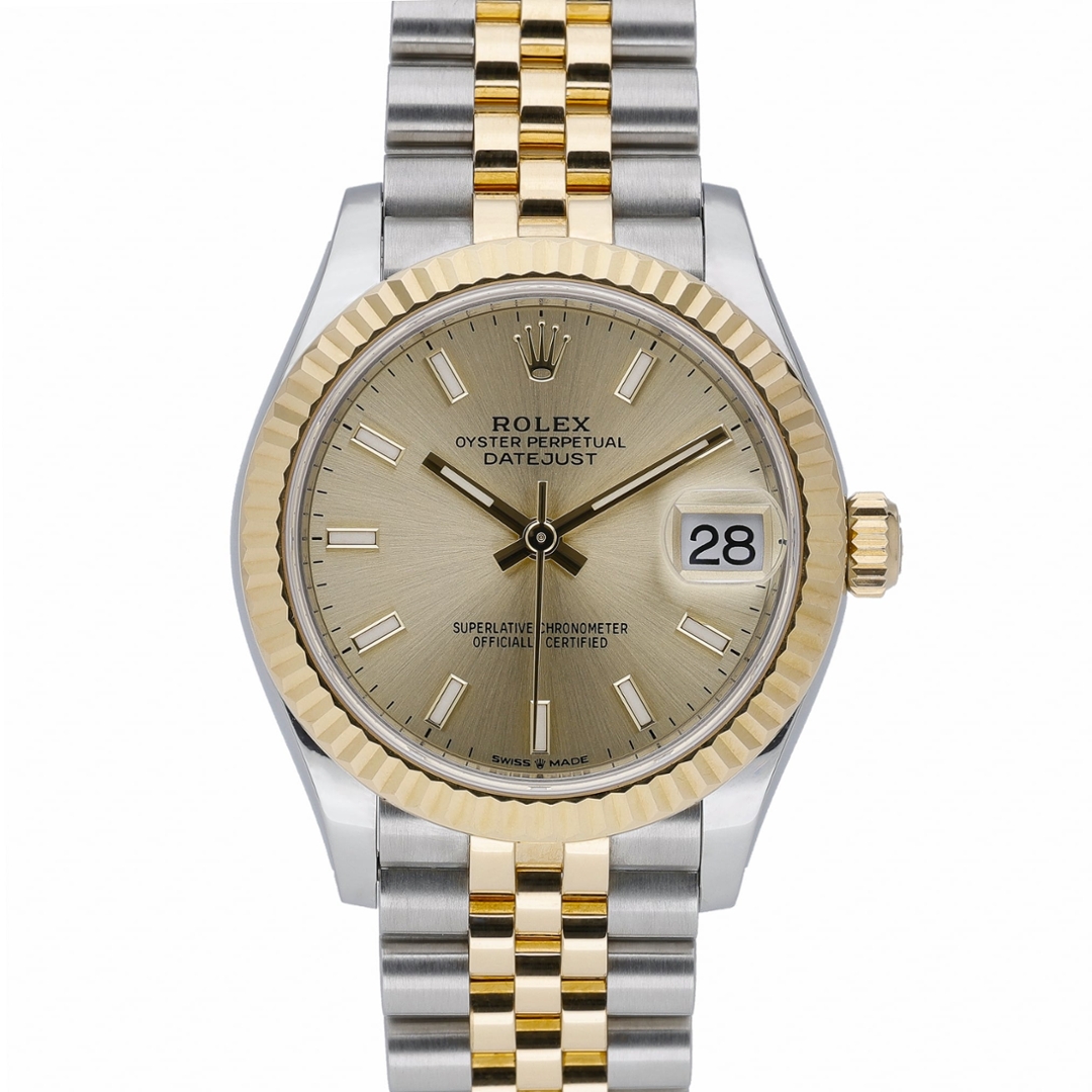 A bi-metal Rolex Datejust reference 278273 features a 31mm stainless steel case paired with an 18ct yellow gold fluted bezel, delivering a classic and instantly recognisable Rolex aesthetic. The champagne dial is clean and well-balanced, fitted with applied baton hour markers and framed by the iconic Cyclops date window at 3 o’clock. The yellow Rolesor bracelet completes the look with a refined yet versatile presence.