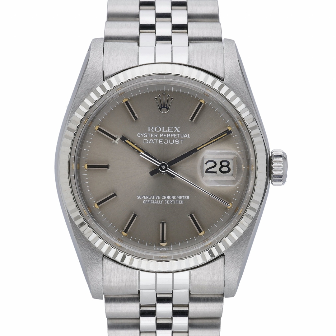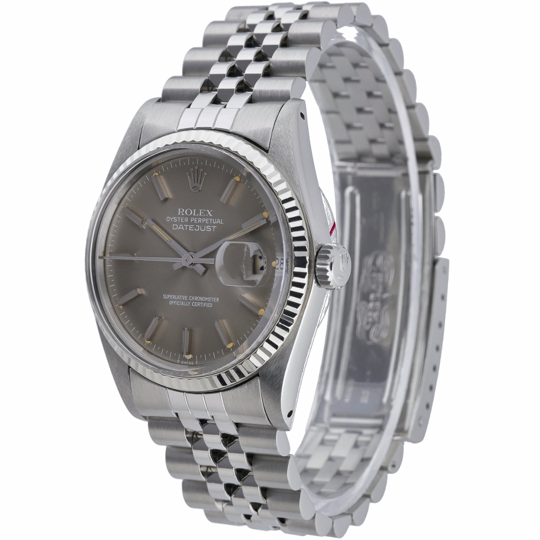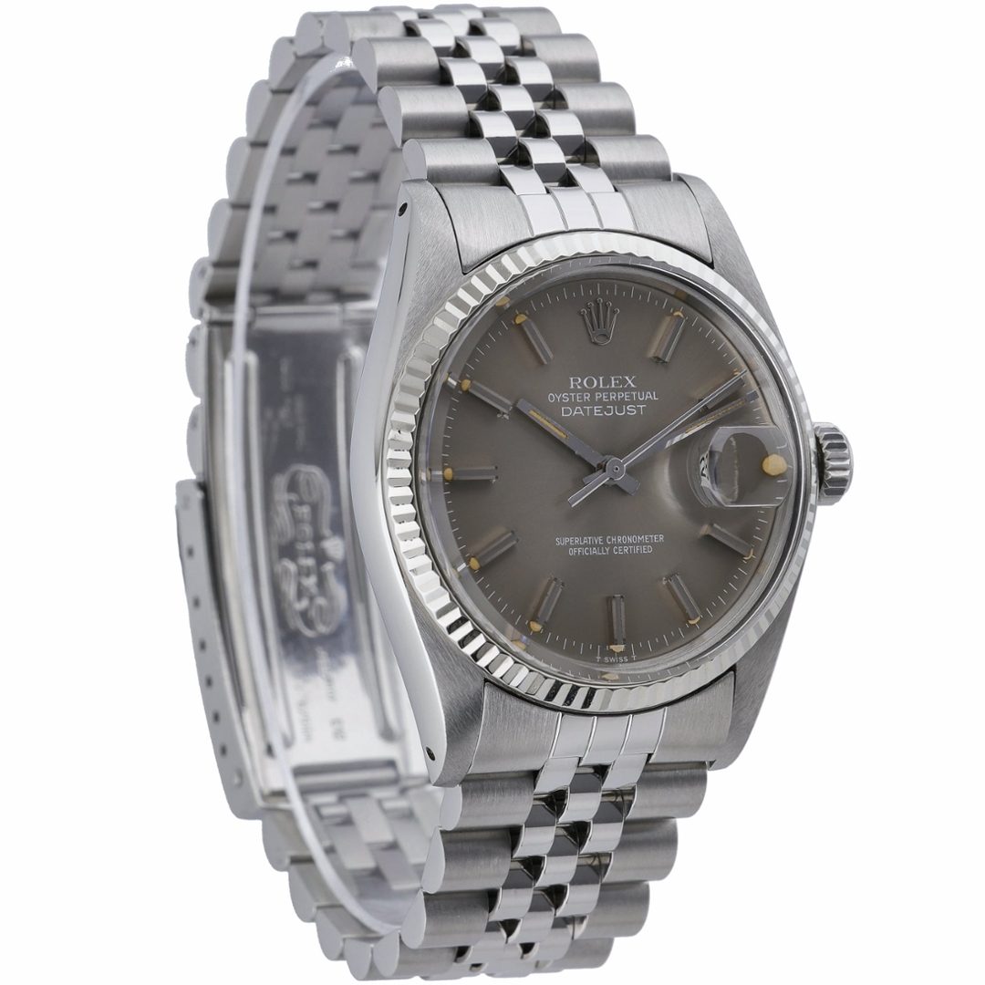A Rolex Datejust 36 (ref. 16014) in stainless steel, featuring an 18ct white gold fluted bezel and a classic grey baton dial with applied hour markers. The dial shows attractive ageing consistent with its vintage character, adding depth and individuality, while the Jubilee bracelet completes the unmistakable Datejust profile.