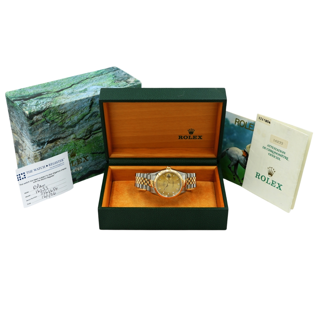 With vintage and bi-metal Rolex models growing increasingly desirable—especially those featuring factory-set diamond dials—this Datejust 16233 stands out as a substantial investment. Its blend of iconic styling, rarity, and increasing demand offers lasting value and a timeless statement of Rolex excellence.