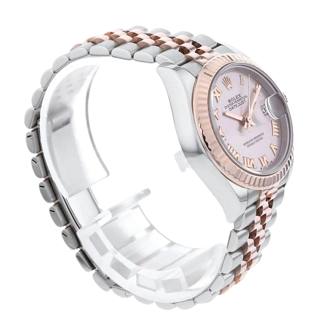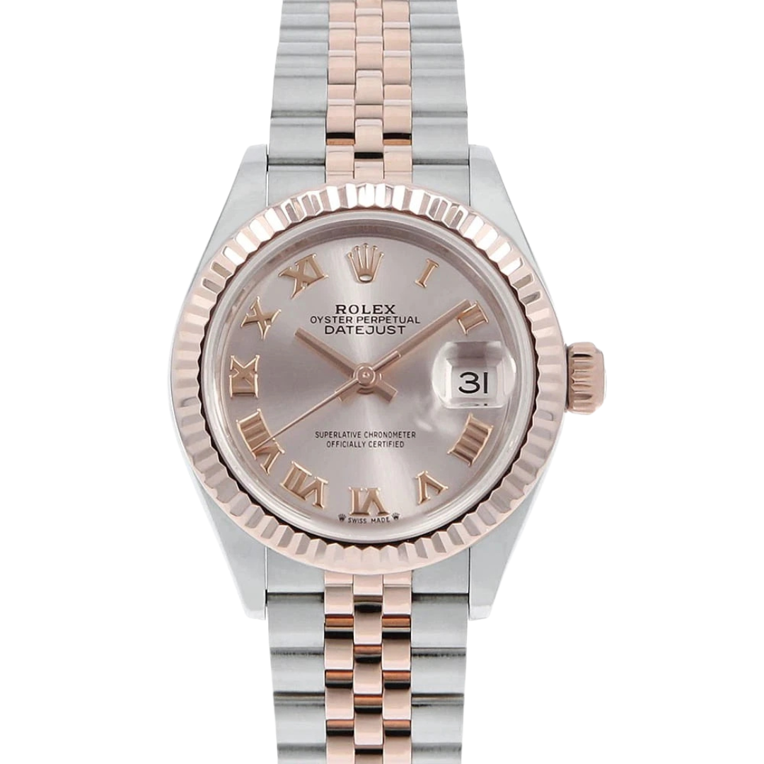 A Rolex Datejust 28 reference 279171 in stainless steel and 18ct Everose gold, featuring a refined 28mm Oyster case complemented by a fluted bezel in solid rose gold. The sundust dial presents a soft, warm tone that pairs seamlessly with the Everose accents, while applied Roman numeral hour markers add a classic elegance, maintaining excellent balance and legibility.