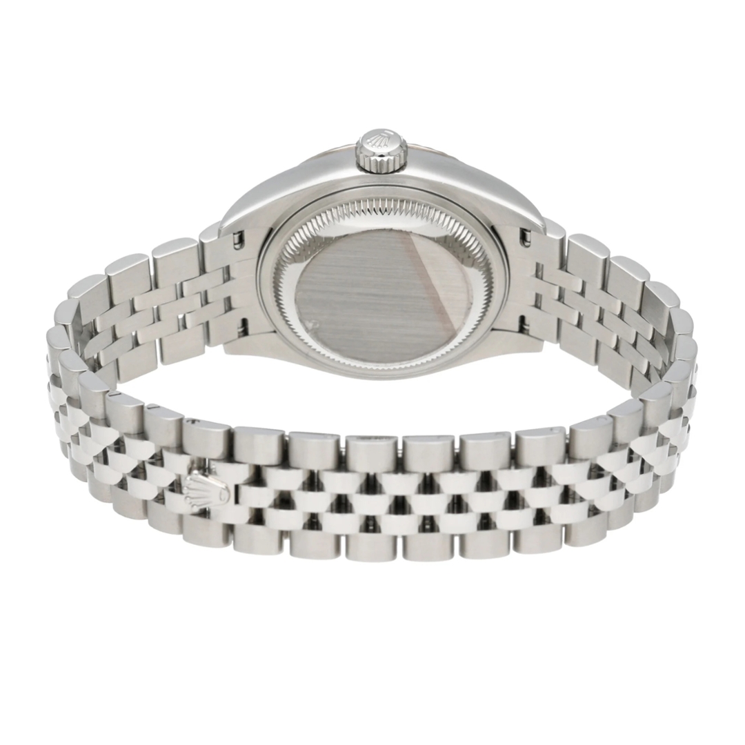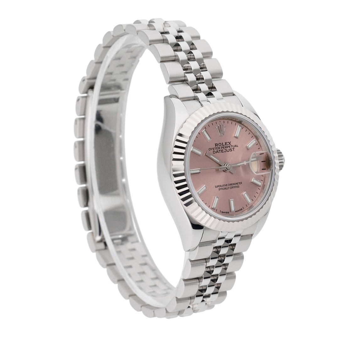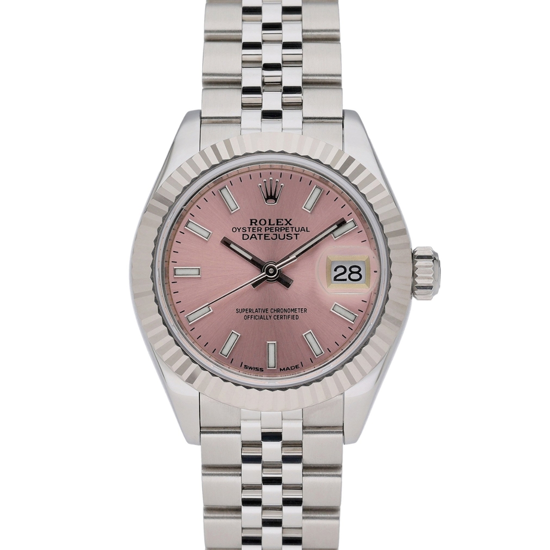A Rolex Datejust 28 reference 279174 in stainless steel, enhanced by an 18ct white gold fluted bezel and presented in a refined 28mm Oyster case. The soft pink dial introduces a delicate yet distinctive aesthetic, complemented by applied baton hour markers and luminous hands, for a clean, elegant display with excellent legibility.