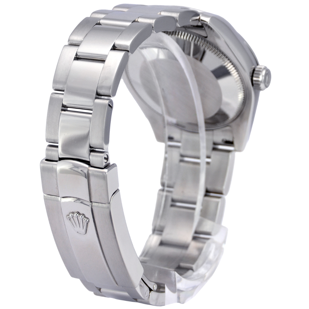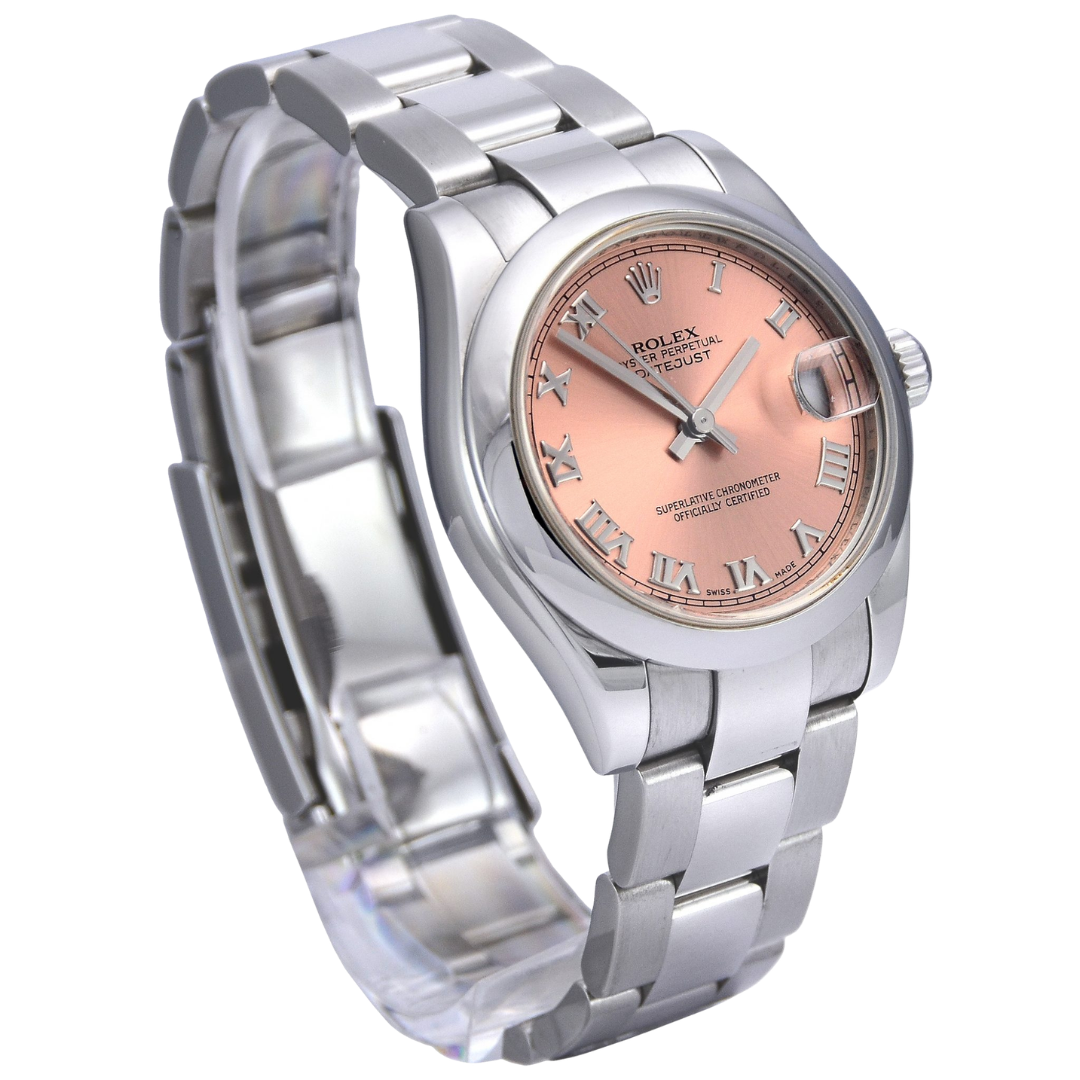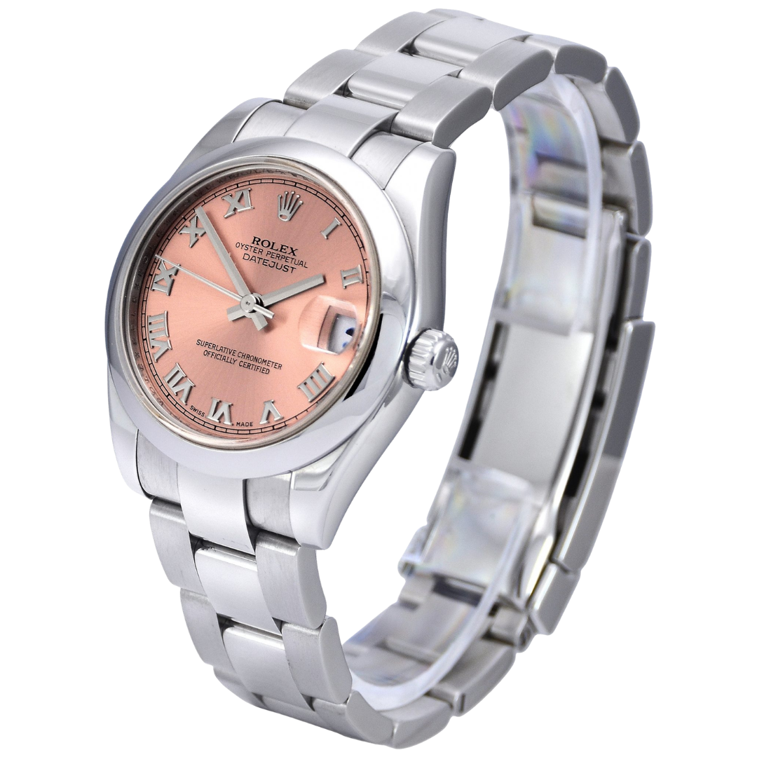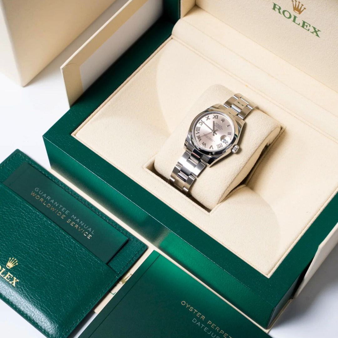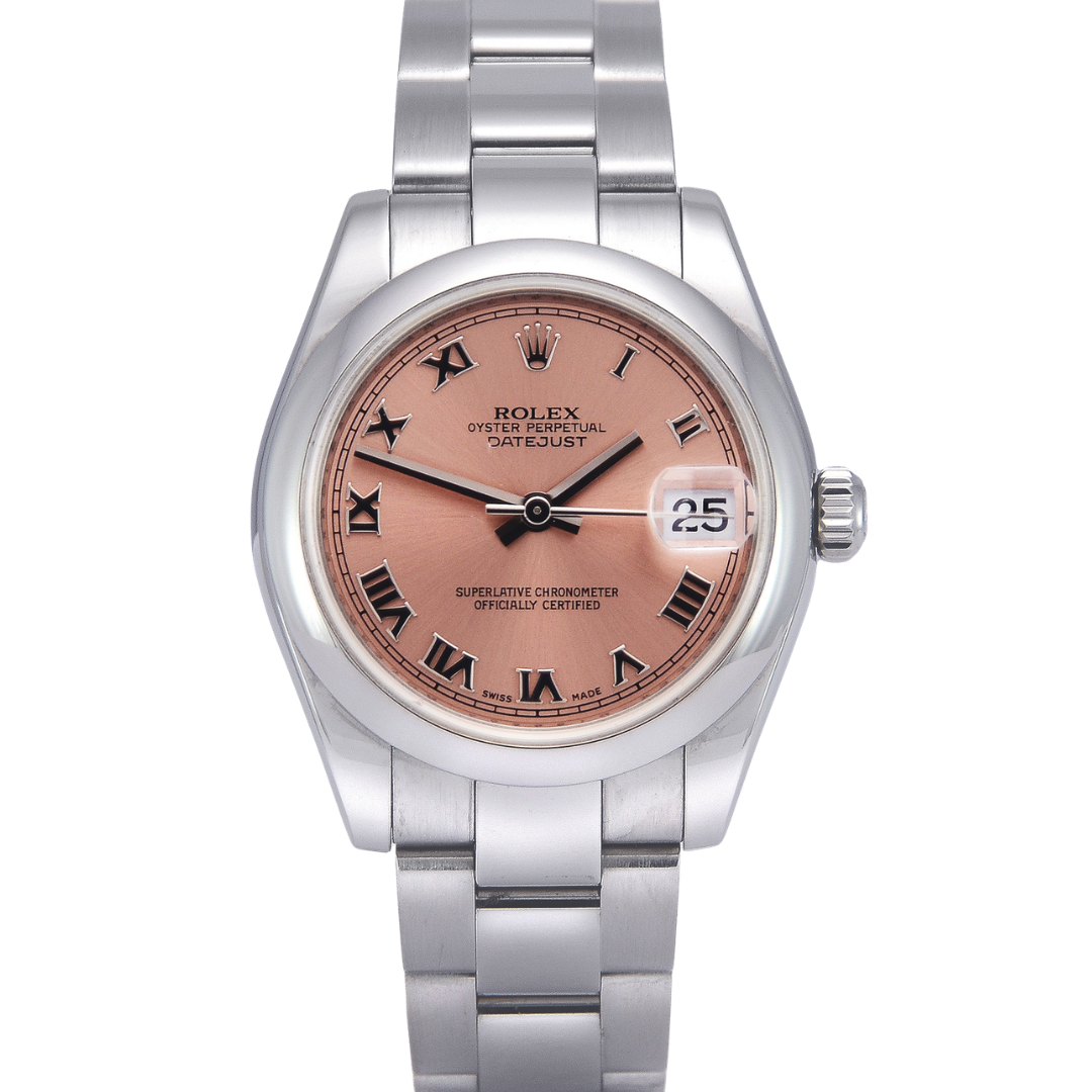 A Rolex Datejust 31 reference 178240 is crafted entirely from stainless steel and features a smooth bezel paired with a distinctive pink dial with applied Roman numerals. The 31mm Oyster case offers refined proportions, while the softer pink tone gives this model a subtle elegance that stands apart from more traditional Datejust configurations. The Oyster bracelet completes the look with a clean, versatile finish suitable for daily wear.