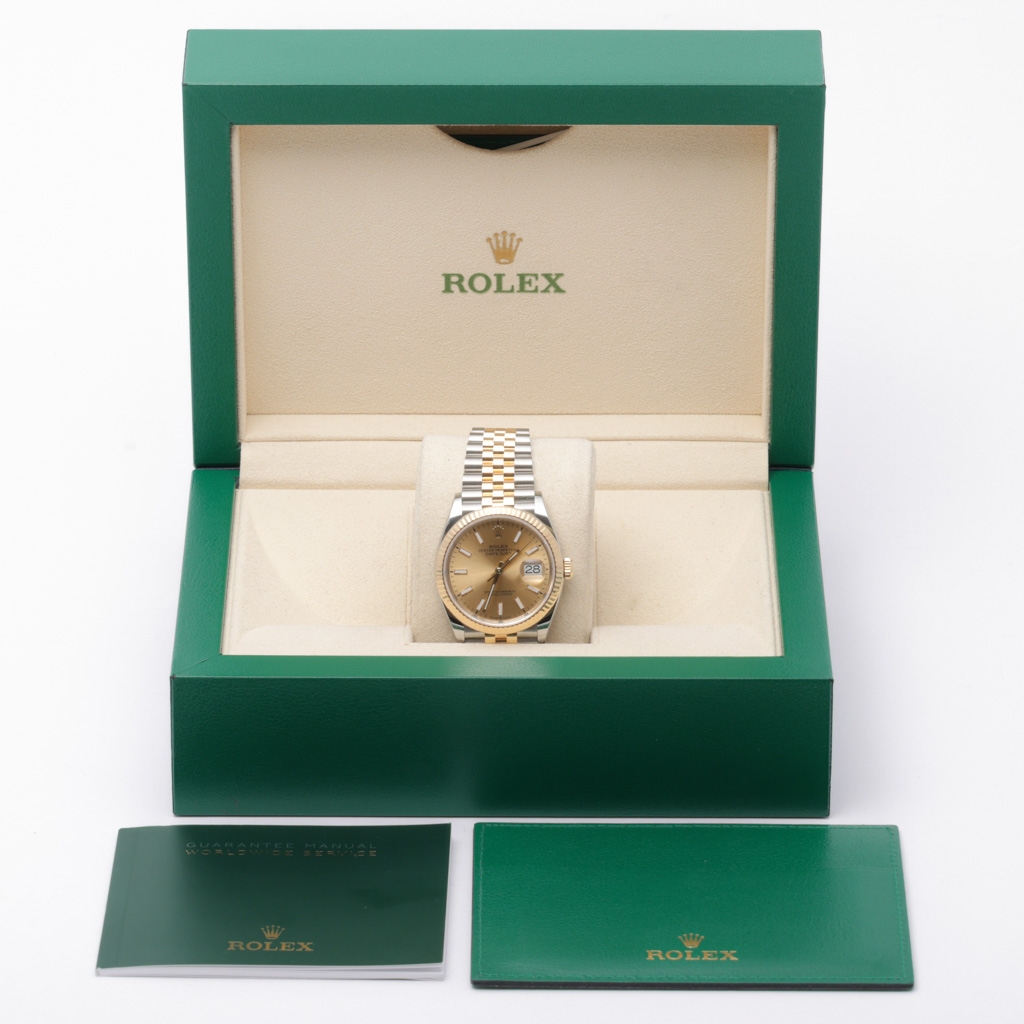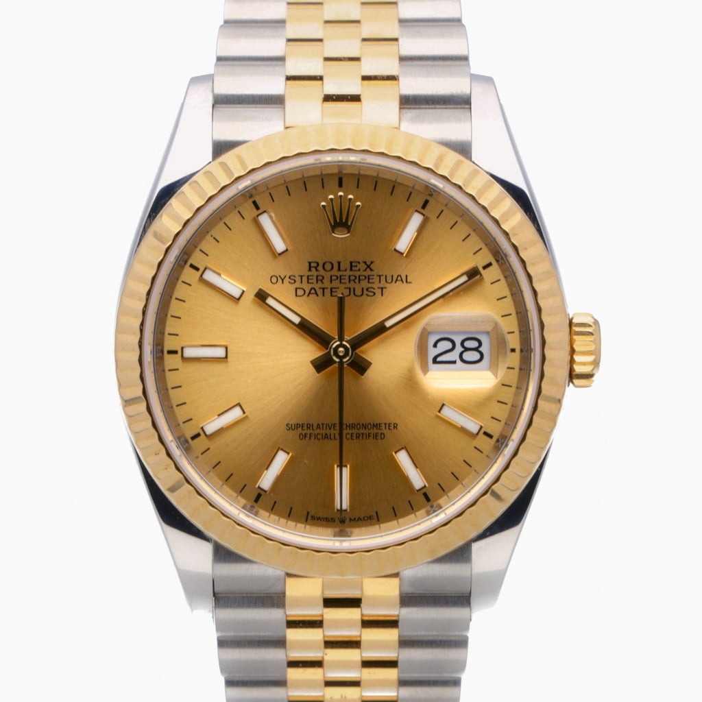 A Rolex Datejust 36 reference 126233 in stainless steel and 18ct yellow gold, featuring a classic champagne sunburst dial with applied baton hour markers and the signature Cyclops date display. The yellow gold fluted bezel adds depth and refinement, pairing seamlessly with the warm dial tones, while the Jubilee bracelet enhances overall elegance and comfort on the wrist.