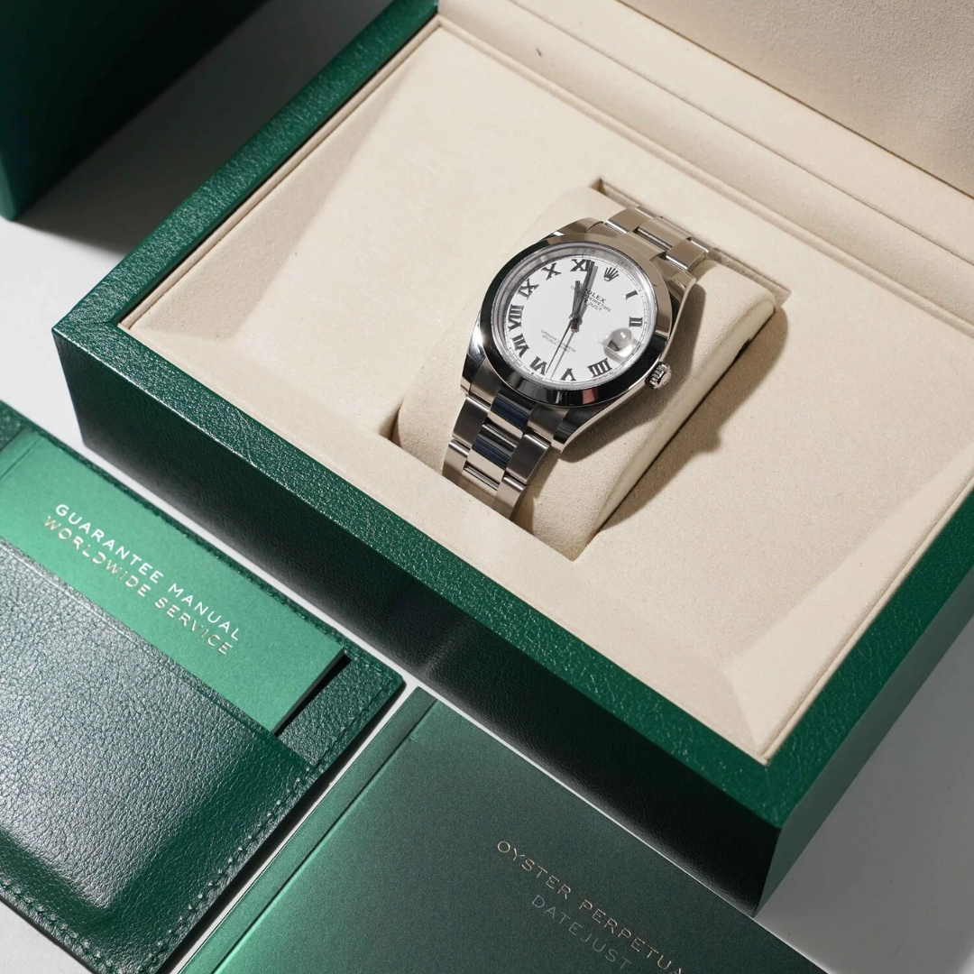 A Rolex Datejust 41 reference 126300 in stainless steel, featuring a crisp white dial with applied black Roman numerals, offering a clean and highly legible aesthetic. The smooth bezel paired with the Oyster bracelet gives this configuration a contemporary, understated look, while the contrasting dial layout enhances everyday versatility in both formal and casual settings.