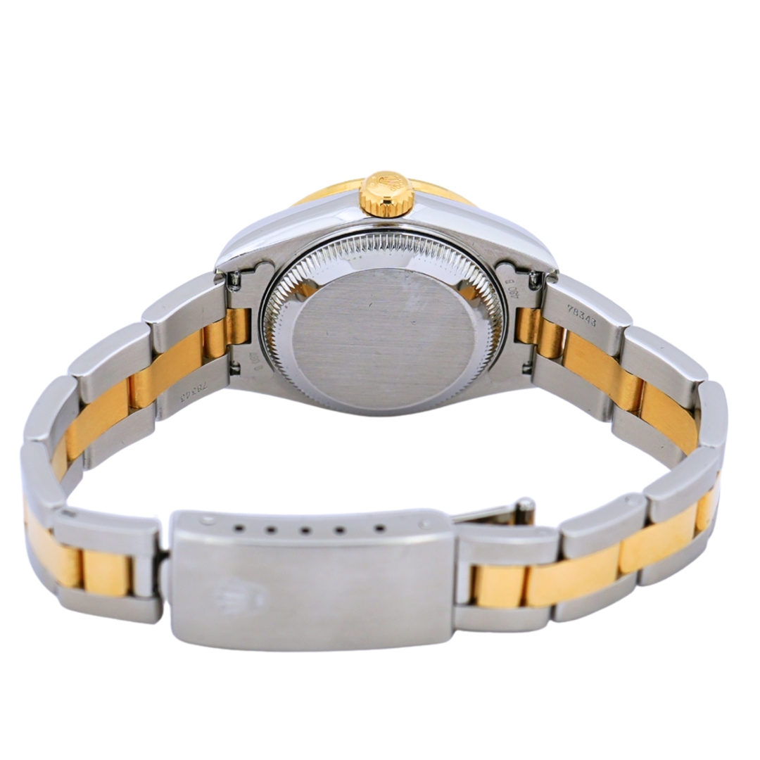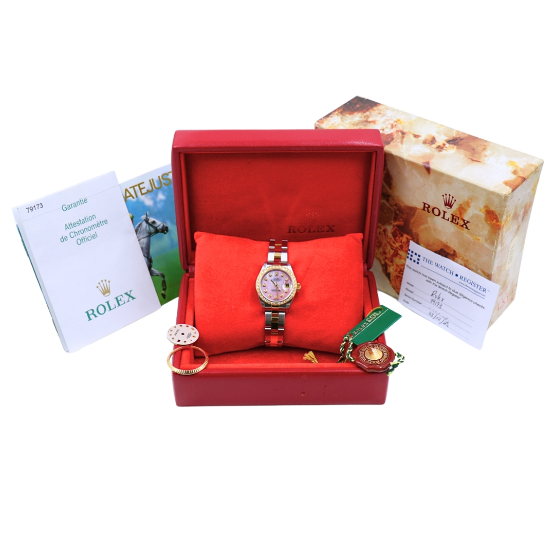 A bi-metal Rolex Datejust, reference 79173, is a highly desirable mid-2000s example of Rolex’s classic ladies’ model. Produced in 2005, the 26mm case combines stainless steel and 18ct yellow gold and is fitted with an afterset diamond bezel.
