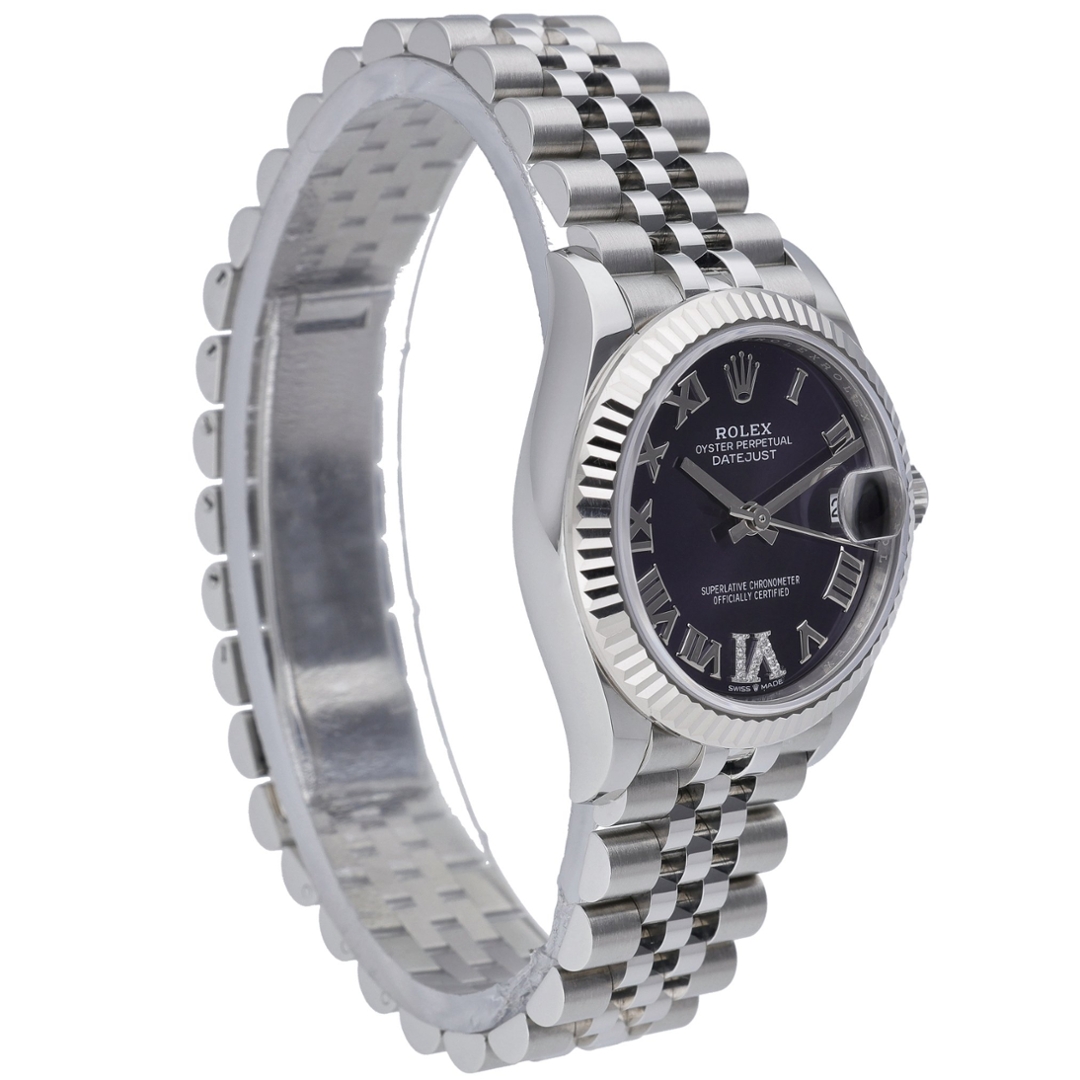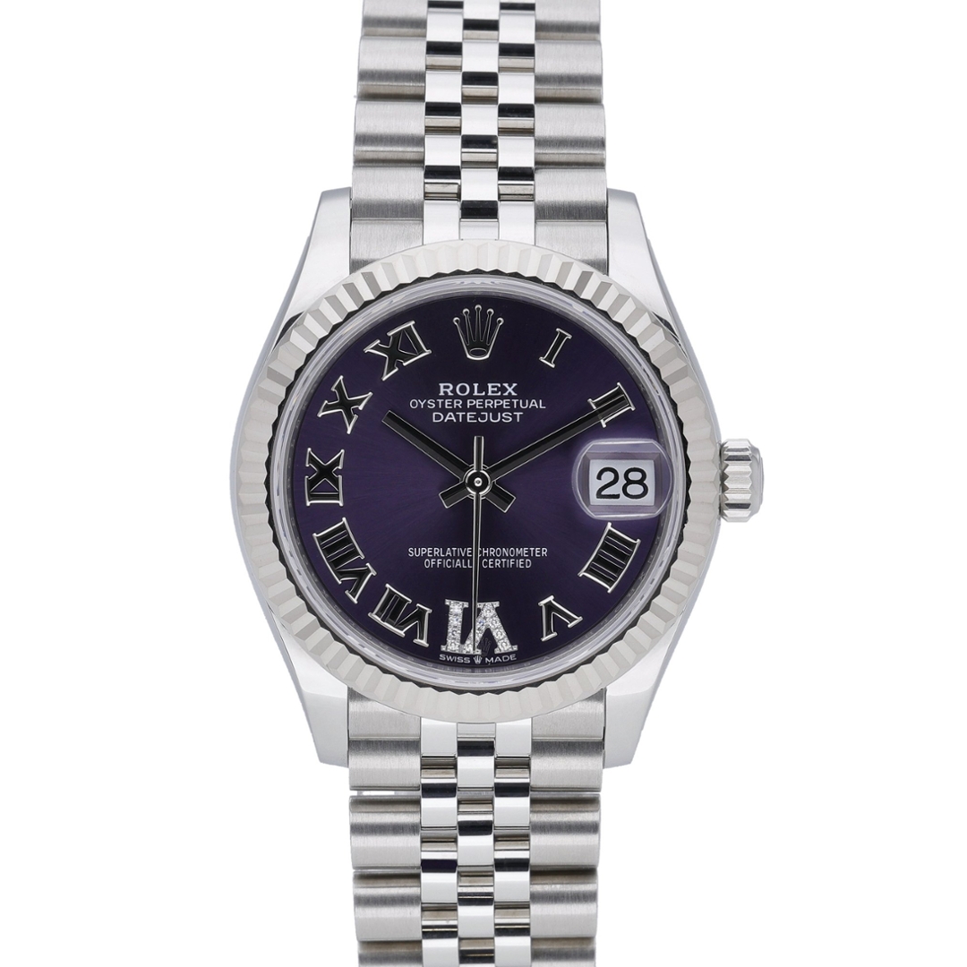 A Rolex Datejust watch crafted in stainless steel, featuring a captivating purple sunray dial that adds a contemporary touch to this timeless classic. Model number 278274, this 2022 example is powered by the Rolex Calibre 2236 automatic movement, offering exceptional accuracy, reliability, and a 55-hour power reserve. The 31mm Oyster case provides a refined and versatile presence on the wrist, complemented by the elegant fluted bezel in solid 18ct white gold—a hallmark of Rolex sophistication.