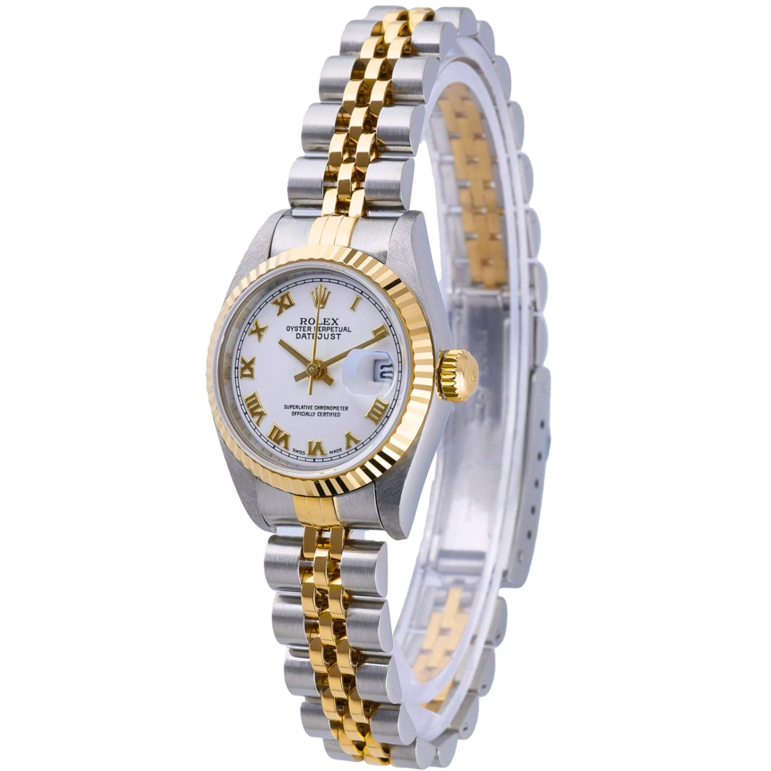 A Bi-Metal Rolex Datejust combining stainless steel and 18ct yellow gold, presented in the classic 26mm case with the iconic Jubilee bracelet. The yellow gold fluted bezel adds a signature Rolex detail, framing a clean white dial set with applied Roman numeral hour markers in gold tones, delivering a timeless and elegant aesthetic that remains highly sought after.