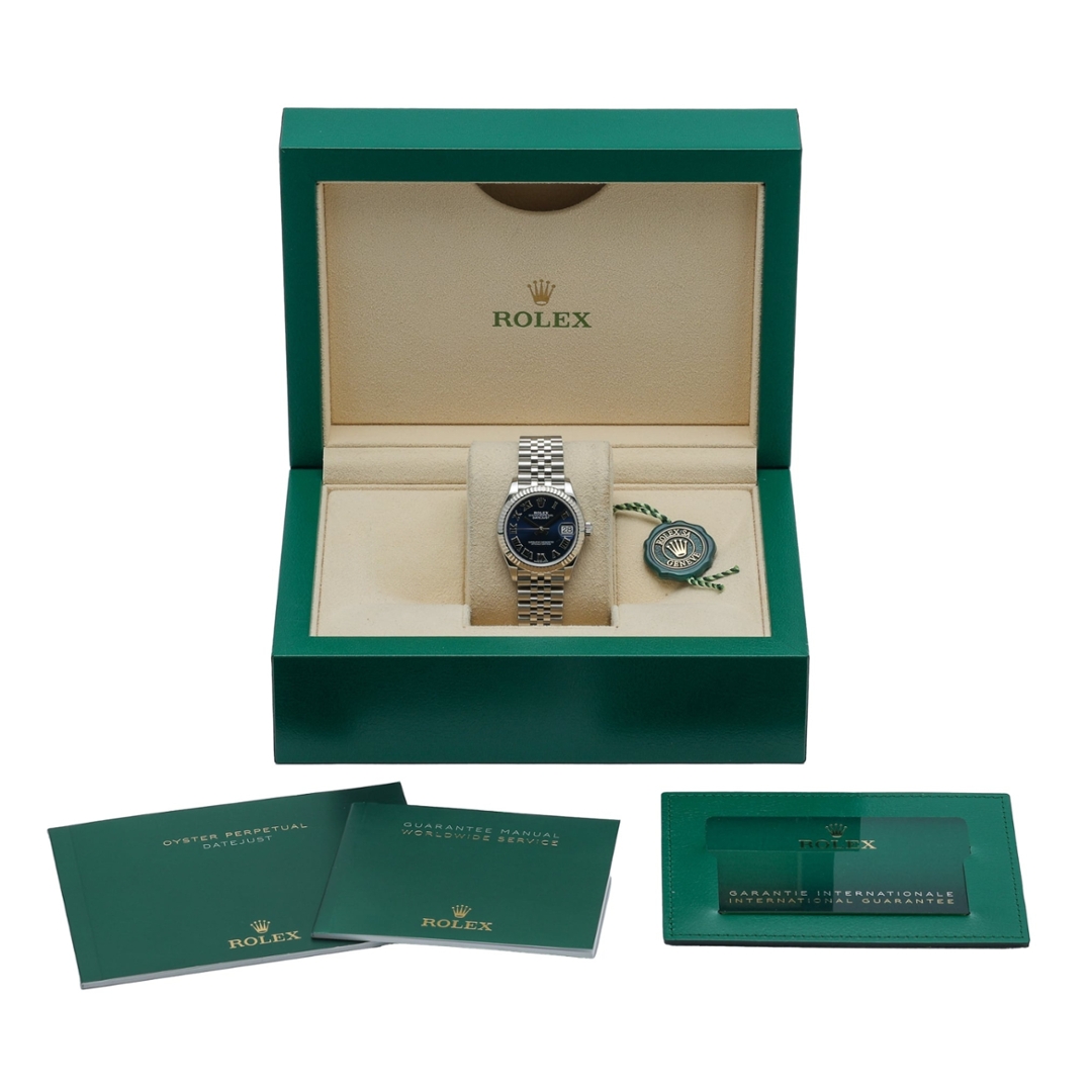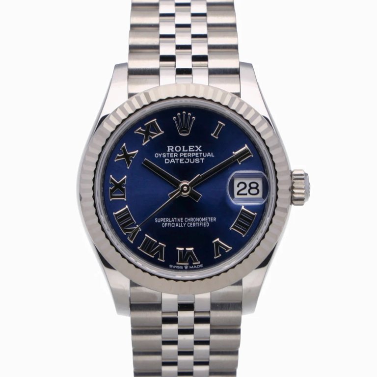 A Rolex Datejust reference 278274 in stainless steel, fitted with an 18ct white gold fluted bezel and a rich blue Roman numeral dial. Produced in 2022, this 31mm Datejust features a refined, versatile profile, balancing classic Rolex aesthetics with a dial configuration that adds depth and character.