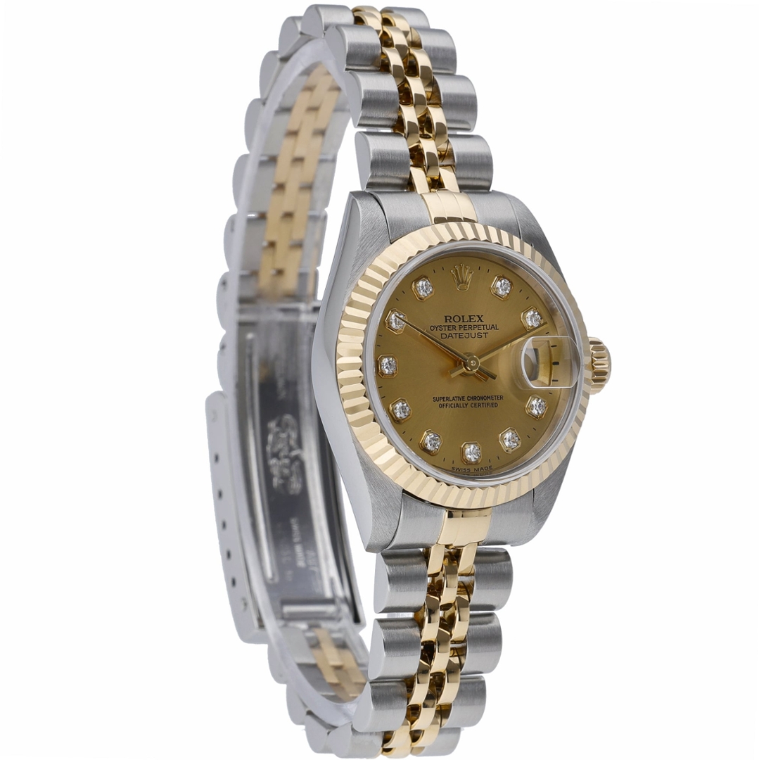 A Bi-Metal Rolex Datejust Watch, Stainless Steel and 18ct Yellow Gold with a Fluted Yellow Gold Bezel and a Champagne Dial with Original Rolex Diamond Numerals.