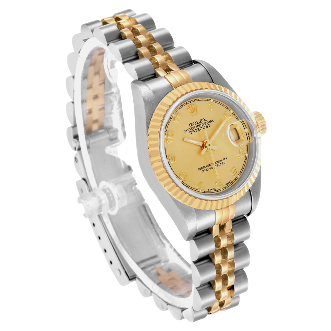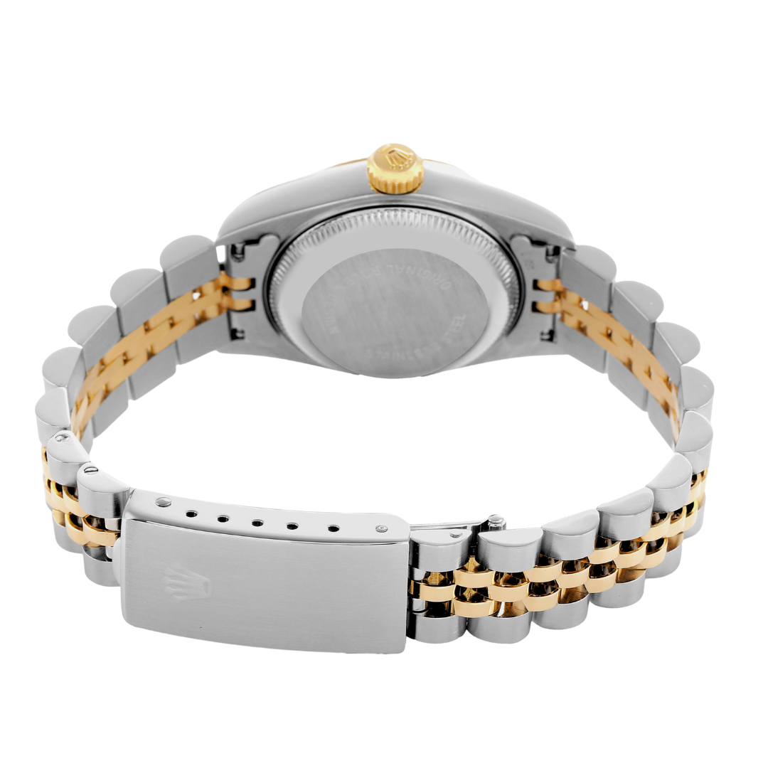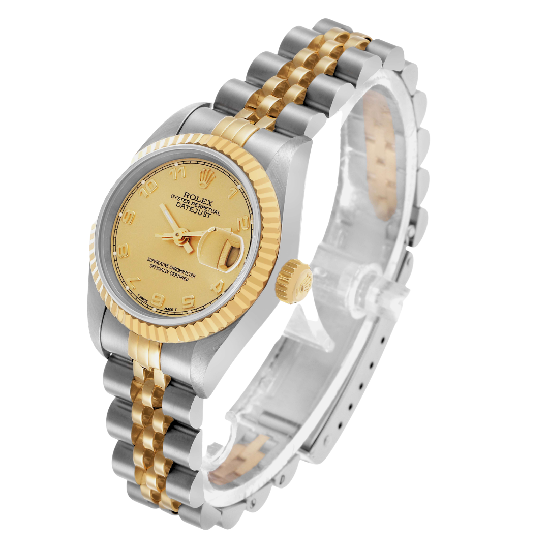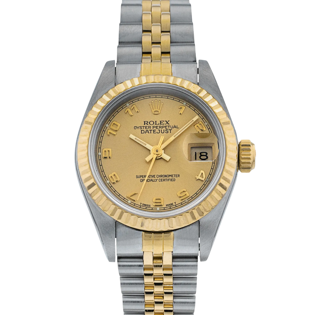 A Rolex Datejust 26 69173, presented in a 26mm Oyster case crafted from stainless steel and 18ct yellow gold, embodies the classic elegance that defines the Datejust line. The champagne dial features applied Arabic numerals, offering a warm and distinctive aesthetic, complemented by matching hands and refined detailing. The signature Cyclops lens at 3 o’clock enhances the date display, while the fluted yellow gold bezel provides the unmistakable light reflection synonymous with Rolex design.