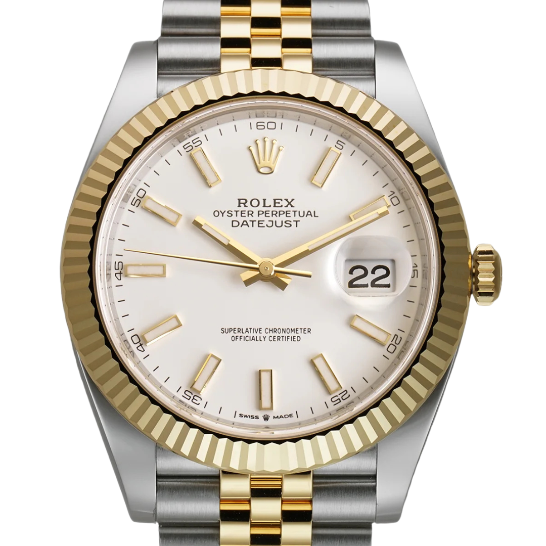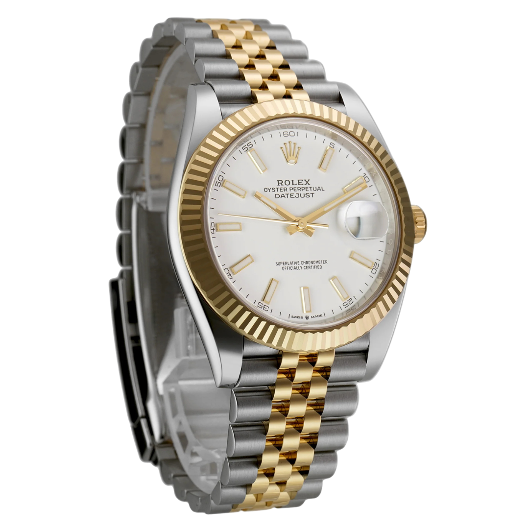 A Bi-Metal Rolex Datejust 41 Watch, Stainless Steel and 18ct Yellow Gold with a Yellow Gold Fluted Bezel on a White Dial